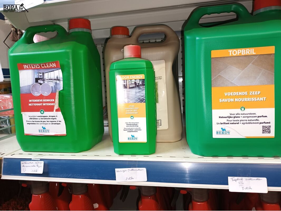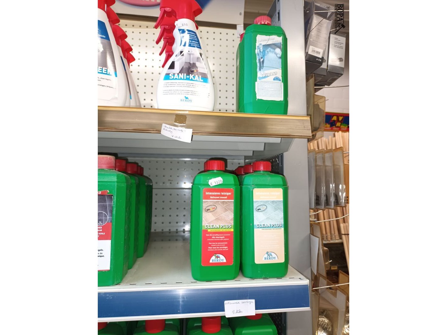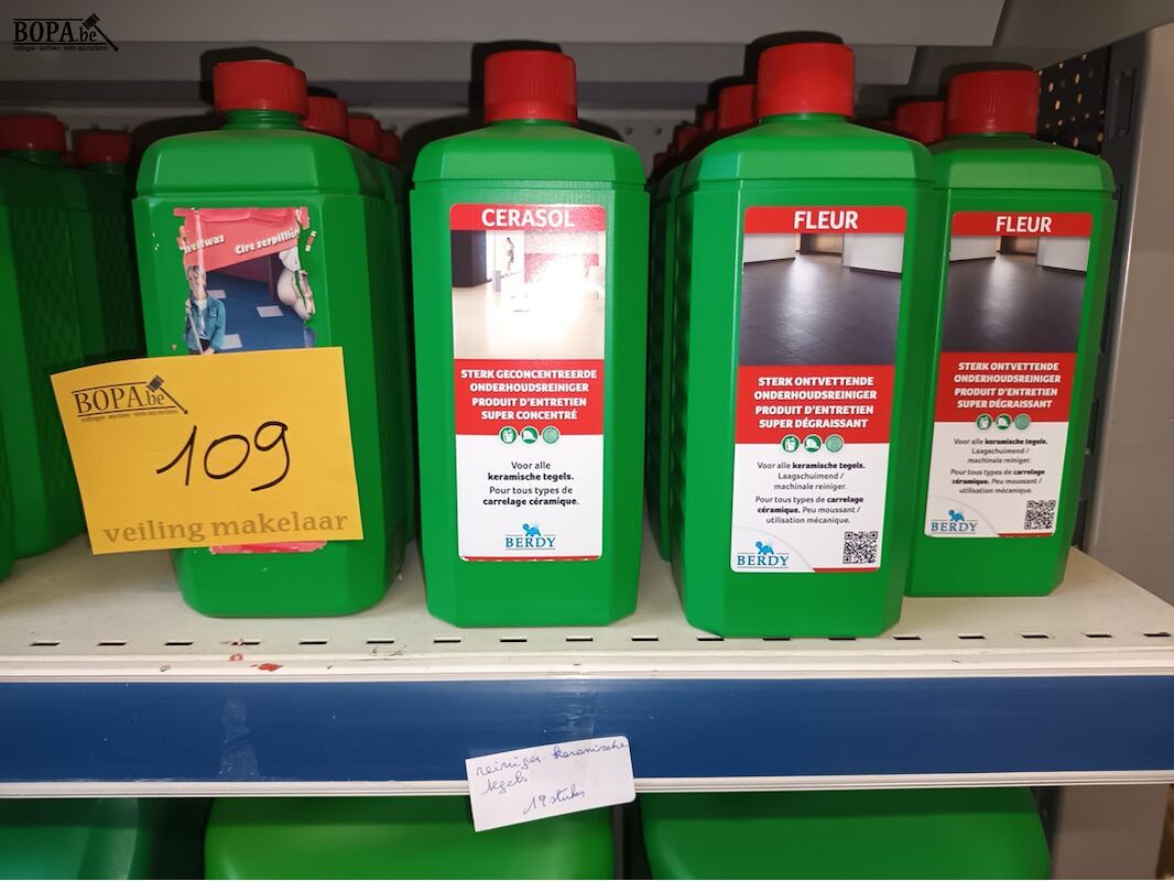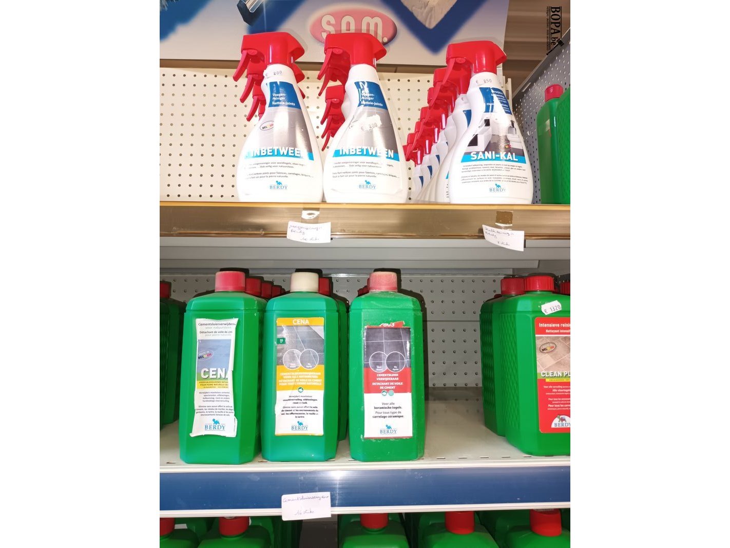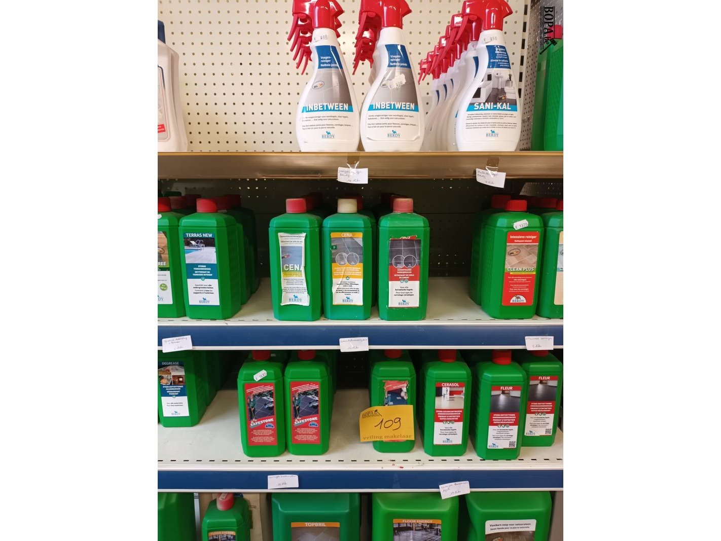 7 x kalkreiniger, 10 x voegenreiniger, 8 x intensieve reiniger, 16 x cementverwijderaar, 6 x anti- groene aanslag, 19 x tegelreiniger, 12 x natuursteenreiniger, 19 insectenverwijderaar, 22 x auto interiuer clean, dweils, 3 stone wash, 5 zeep bidons.