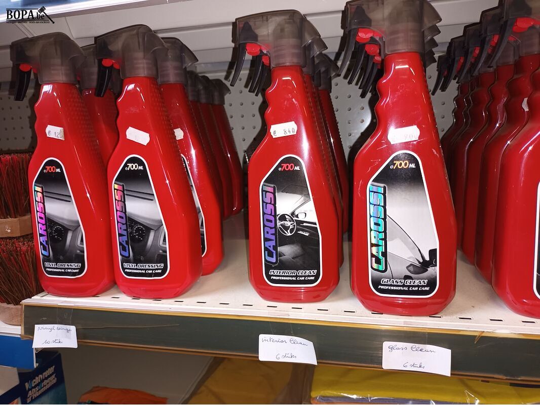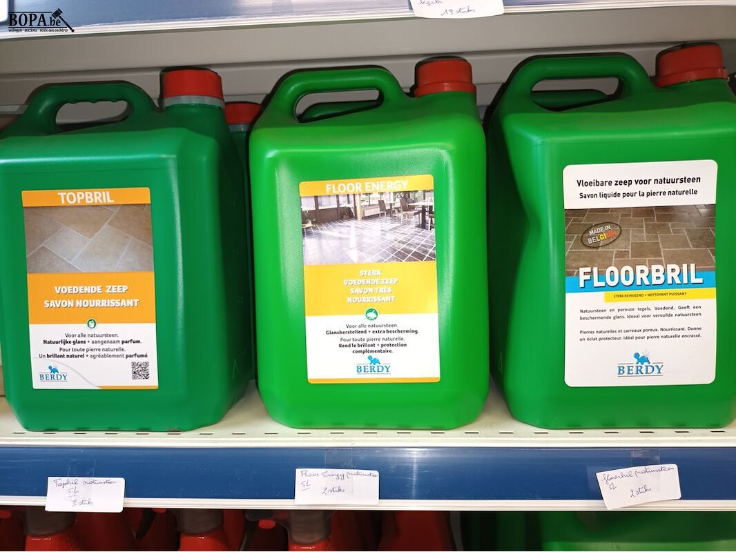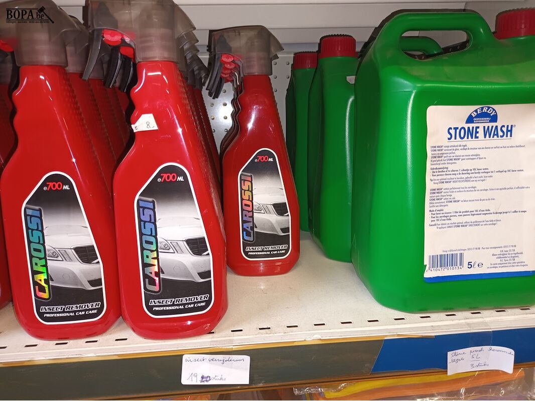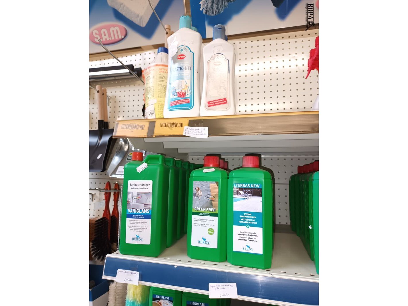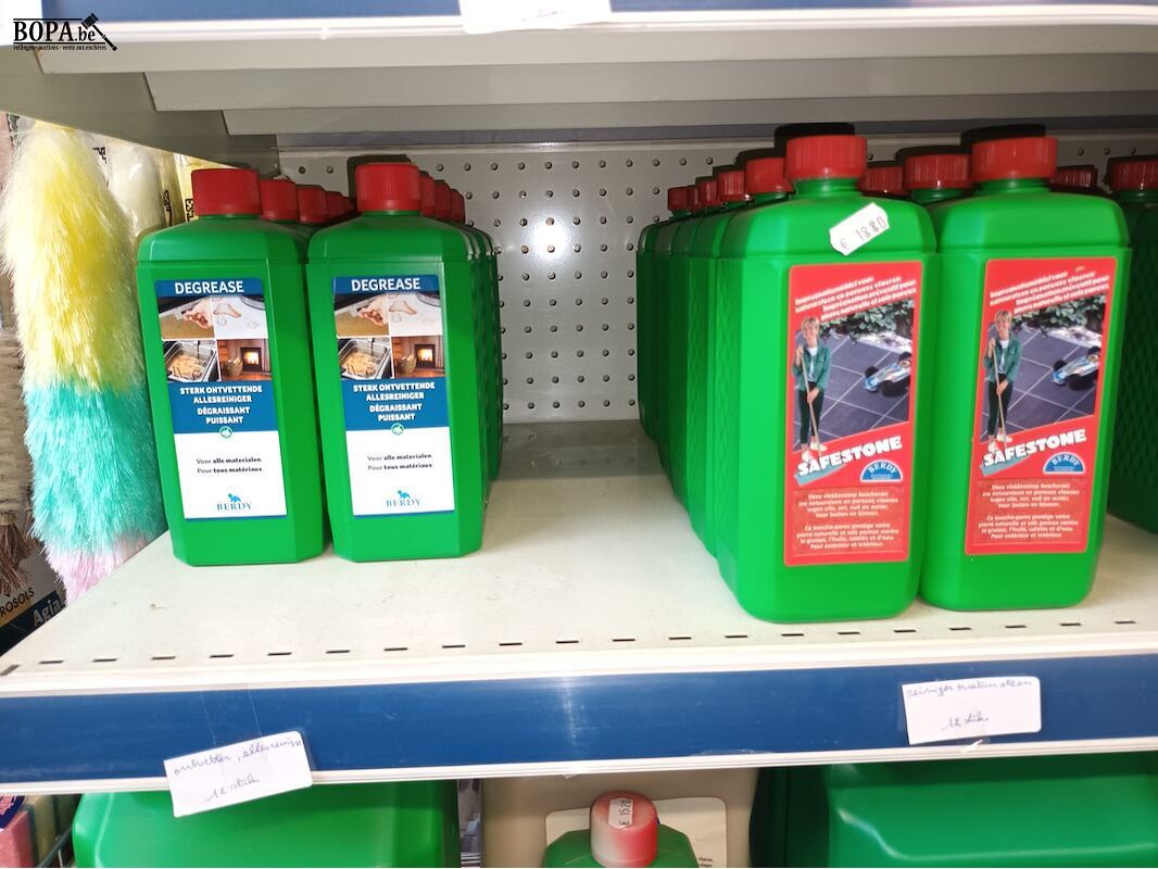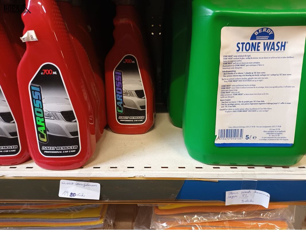 7 x kalkreiniger, 10 x voegenreiniger, 8 x intensieve reiniger, 16 x cementverwijderaar, 6 x anti- groene aanslag, 19 x tegelreiniger, 12 x natuursteenreiniger, 19 insectenverwijderaar, 22 x auto interiuer clean, dweils, 3 stone wash, 5 zeep bidons.