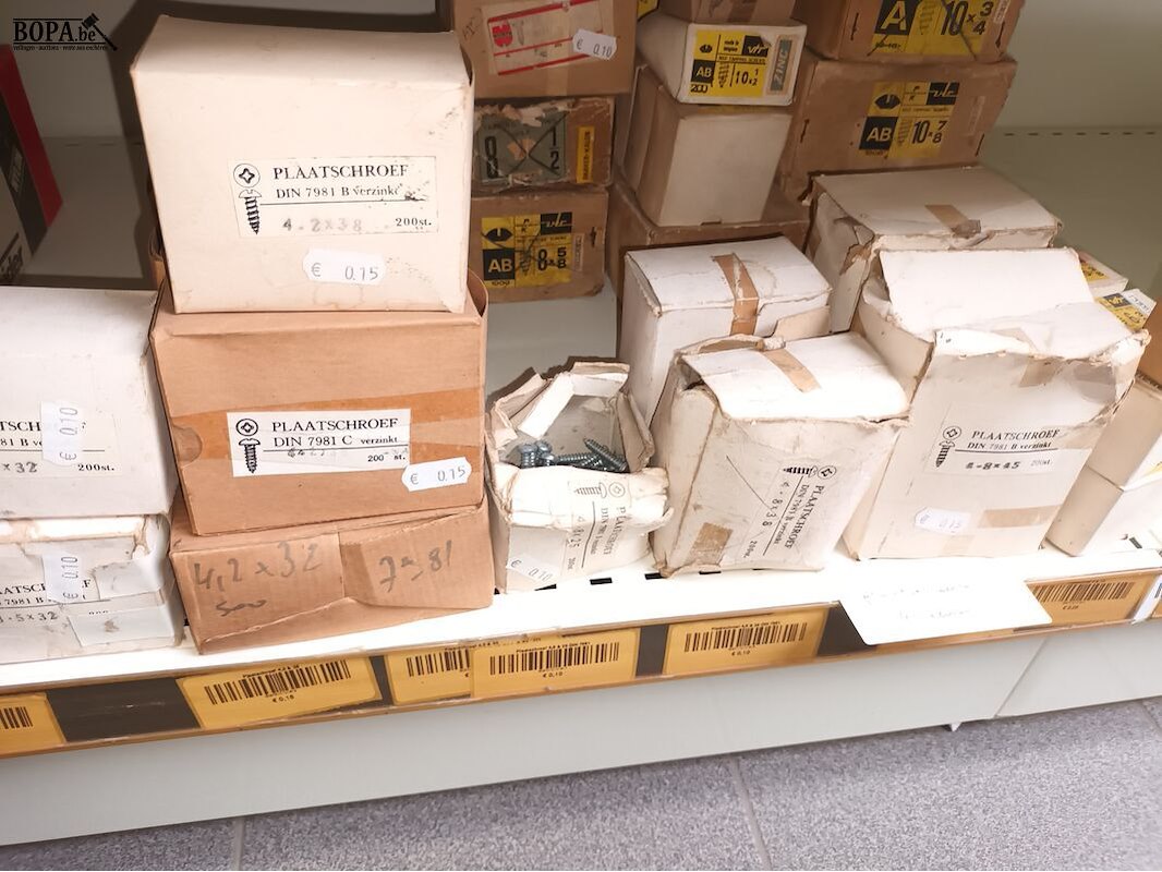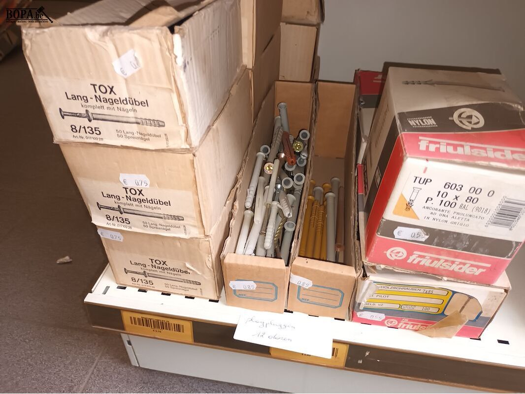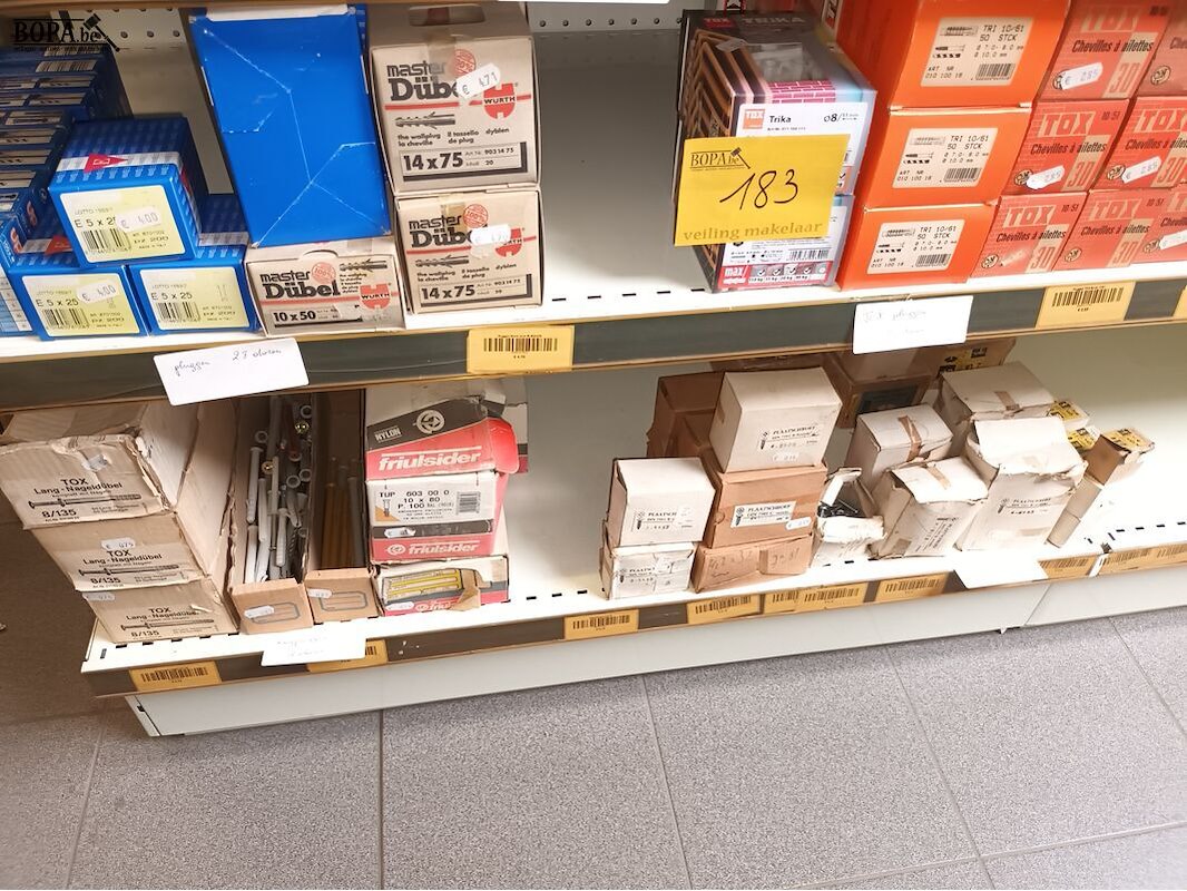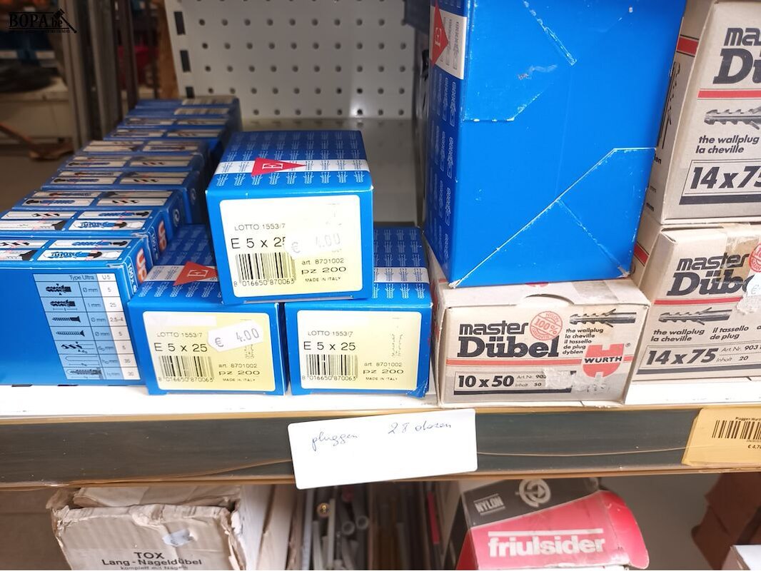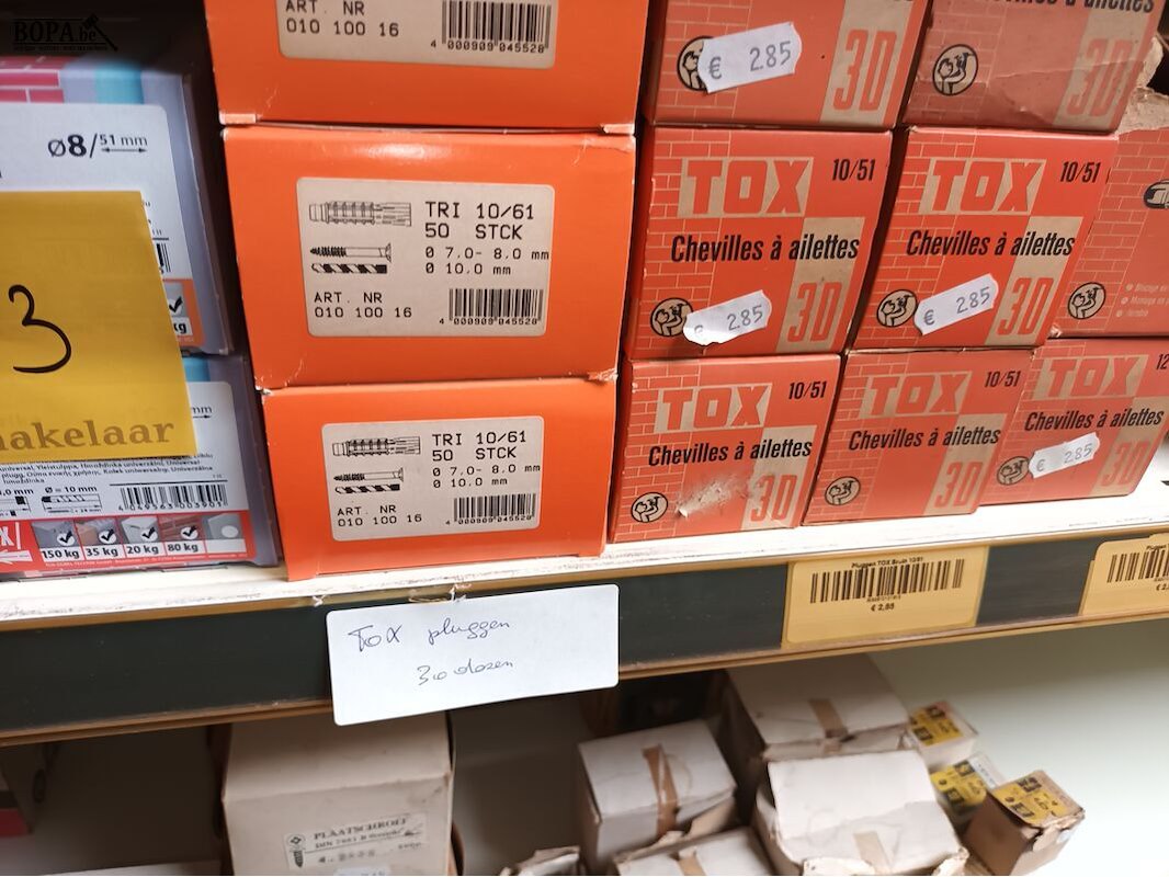 28 dozen pluggen, 30 dozen TOX pluggen, 12 dozen slagpluggen, 20 dozen spaanplaatschroeven.