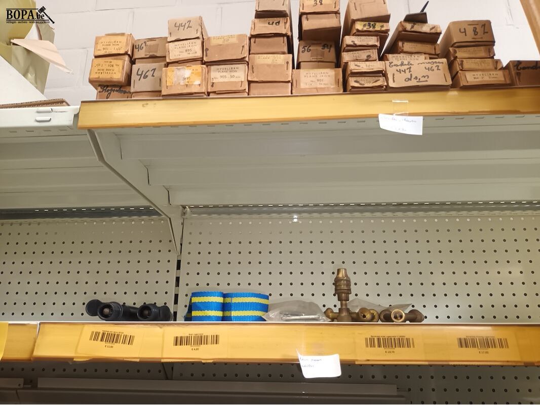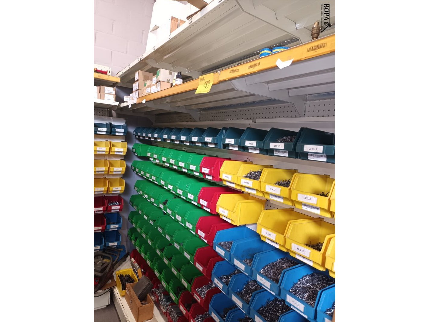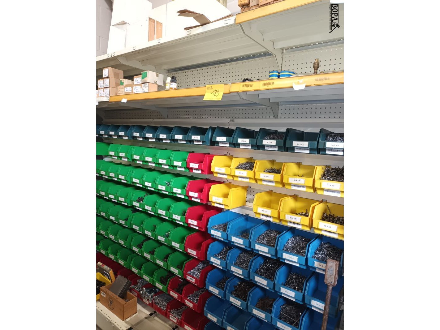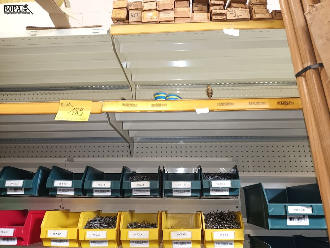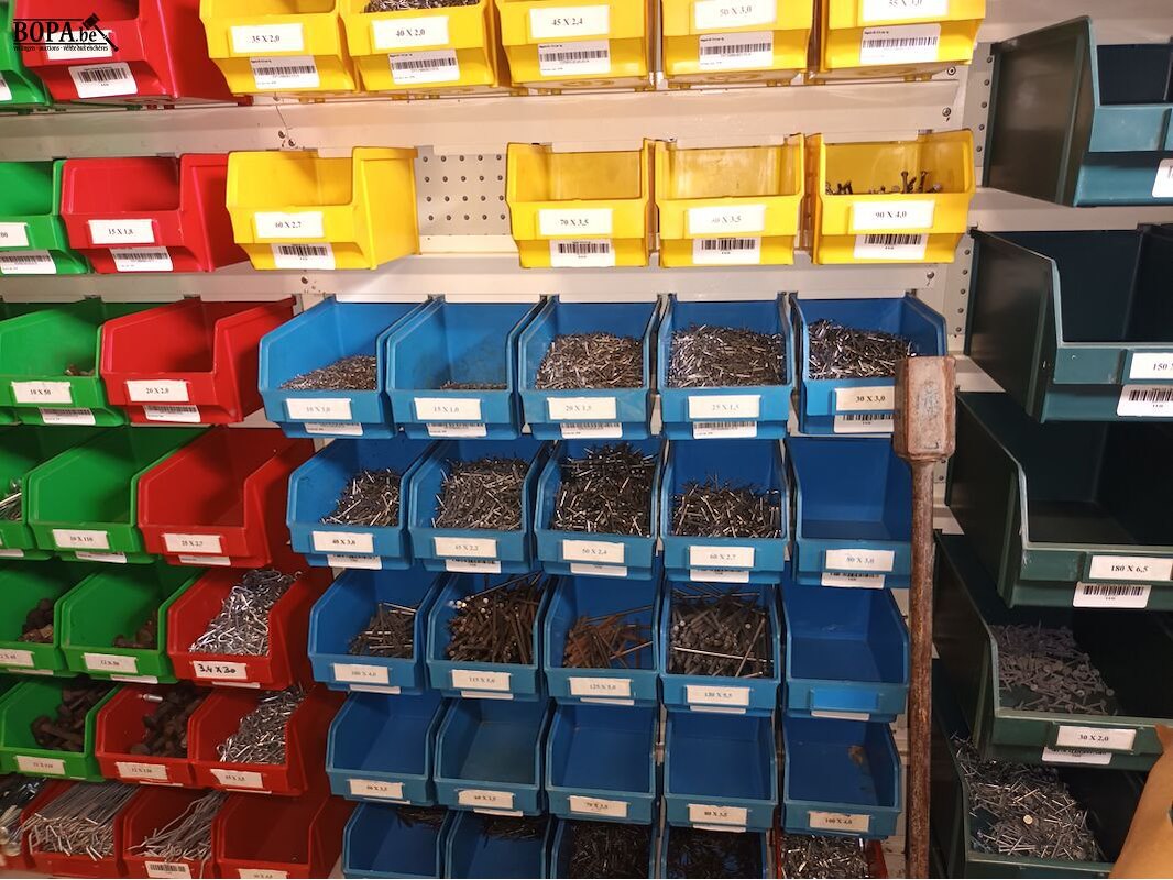 Metalen wandrek met inhoud. Sorteervakjes met nagels, schaven, etc.