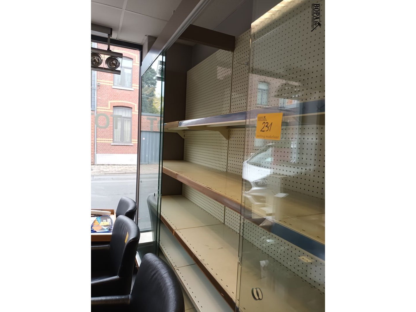 Winkel wand vitrine met 1 ruit kapot. 286 x 50 x 230 cm.