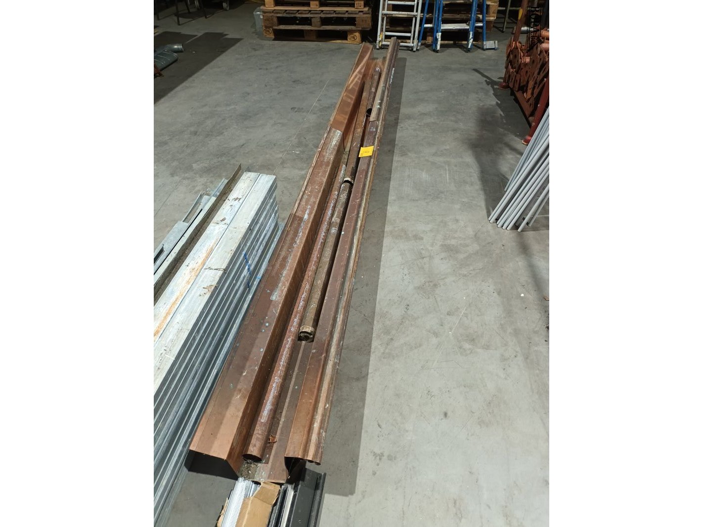 3 koperen goten van 400 x 30 x 20 cm en 4 koperen afvoerbuizen.