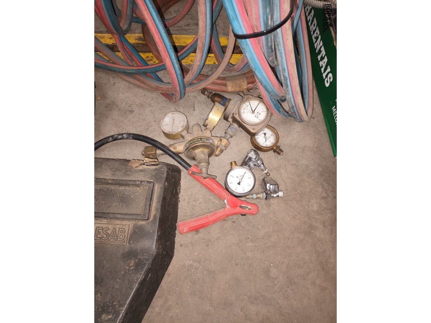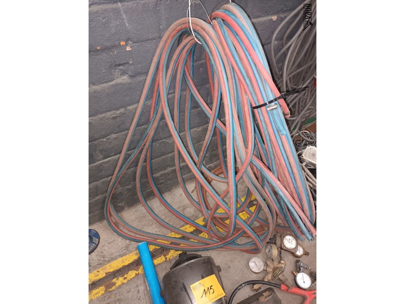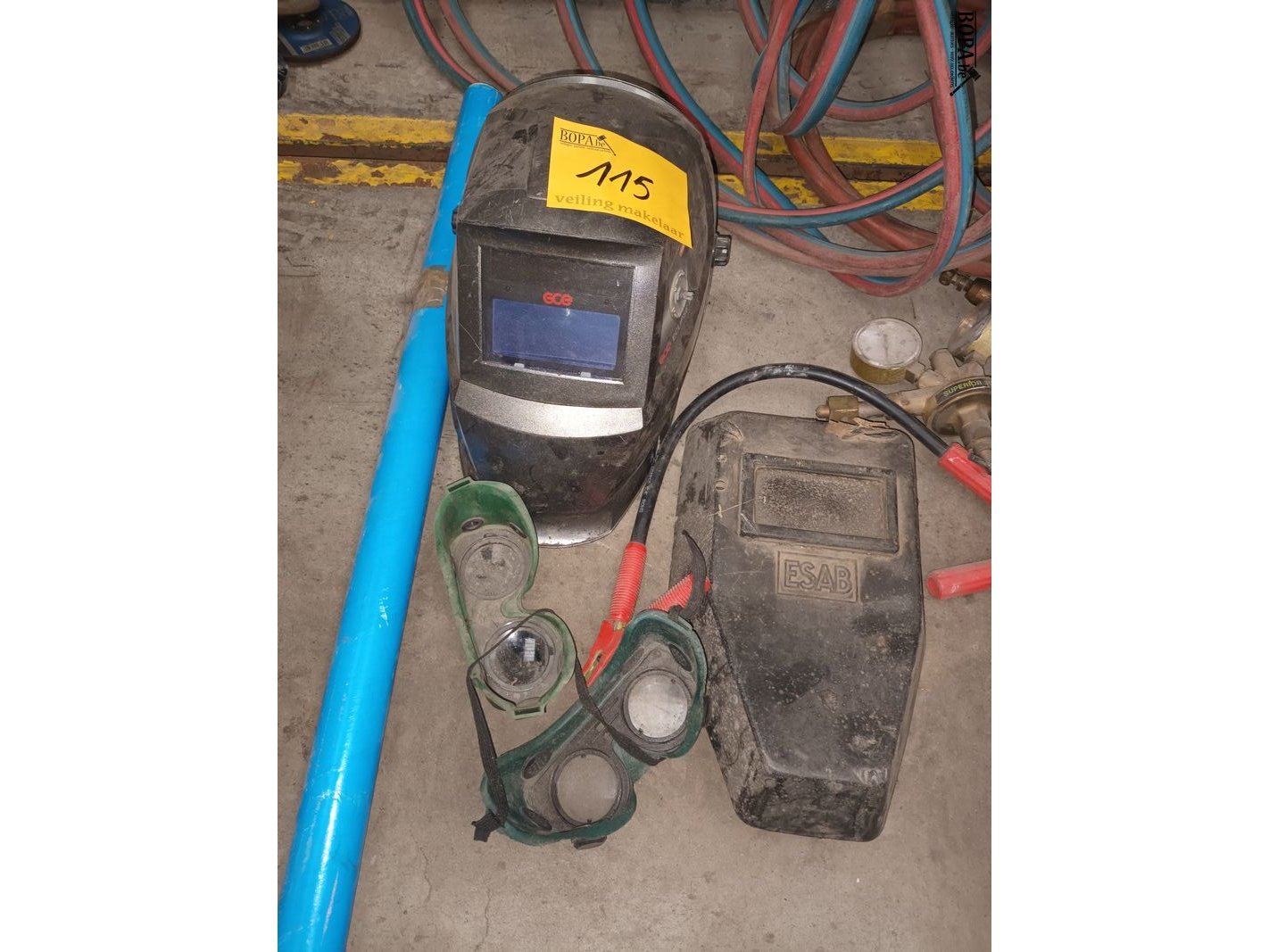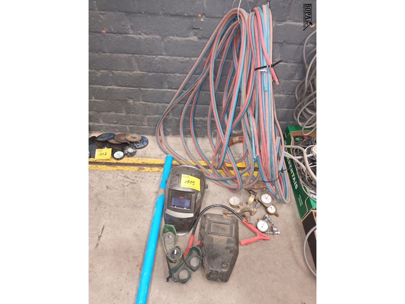 Lot lasmateriaal. Helmen, brillen slangen, meters, bagetten.