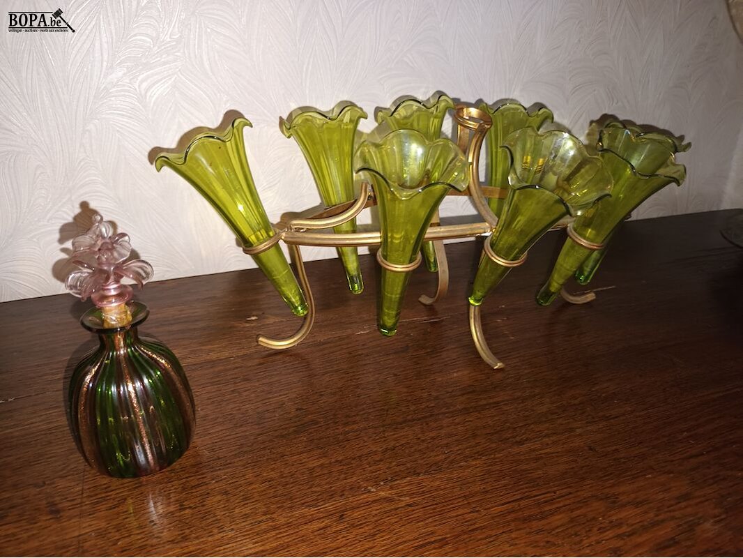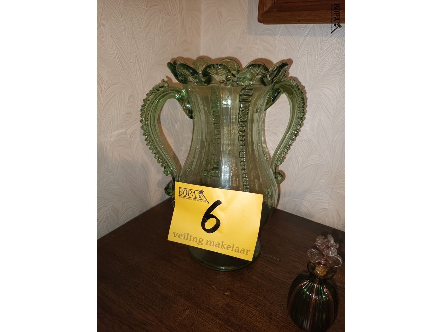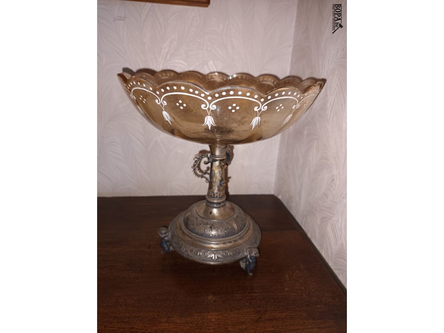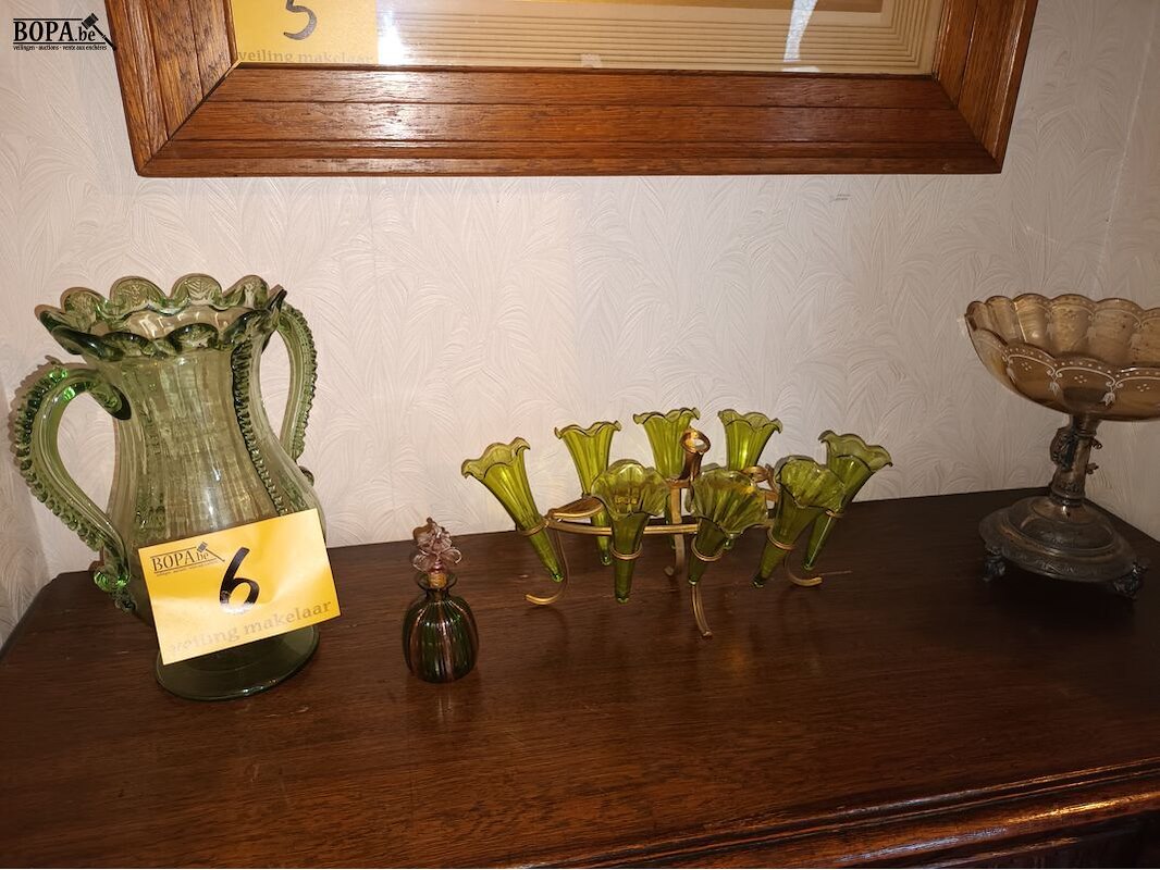 Antiek glaswerk. 4 stuks. Vaas met hoogte 26 cm. Pique-fleur van 34 x 21 x 14 cm. Parfumflesje met hoogte 12 cm en schaal op verzilverde sokkel met diameter 20 cm en hoogte 21 cm.