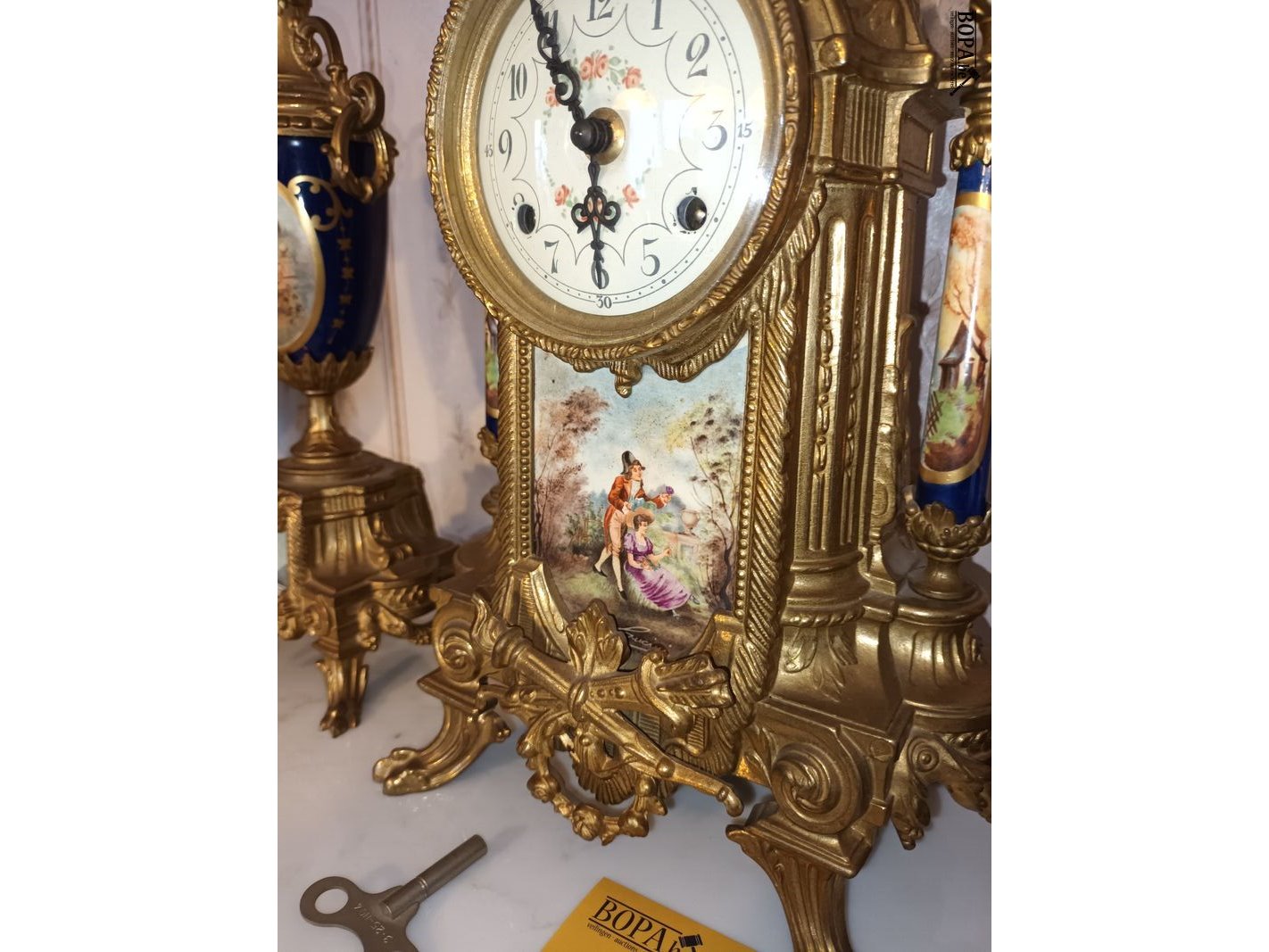 Klokstel in koper en porselein. Hoogte klok is 42 cm. Hoogte siervazen is 32 cm.