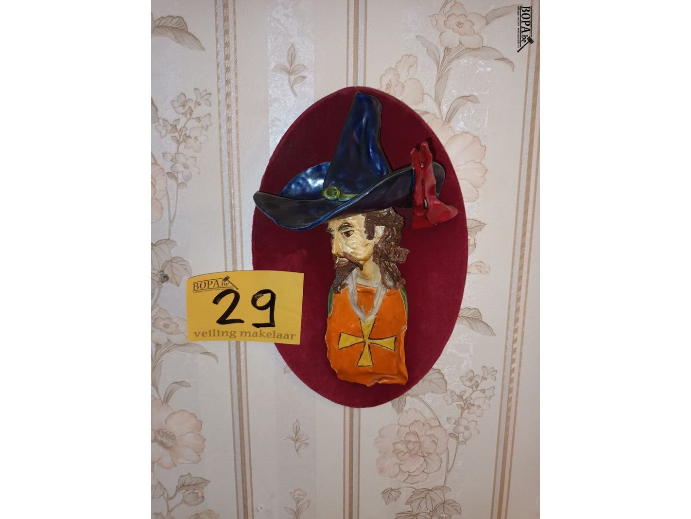 Muurdecoratie ridder in keramiek op ovalen paneel. 20 x 10 x 31 cm.