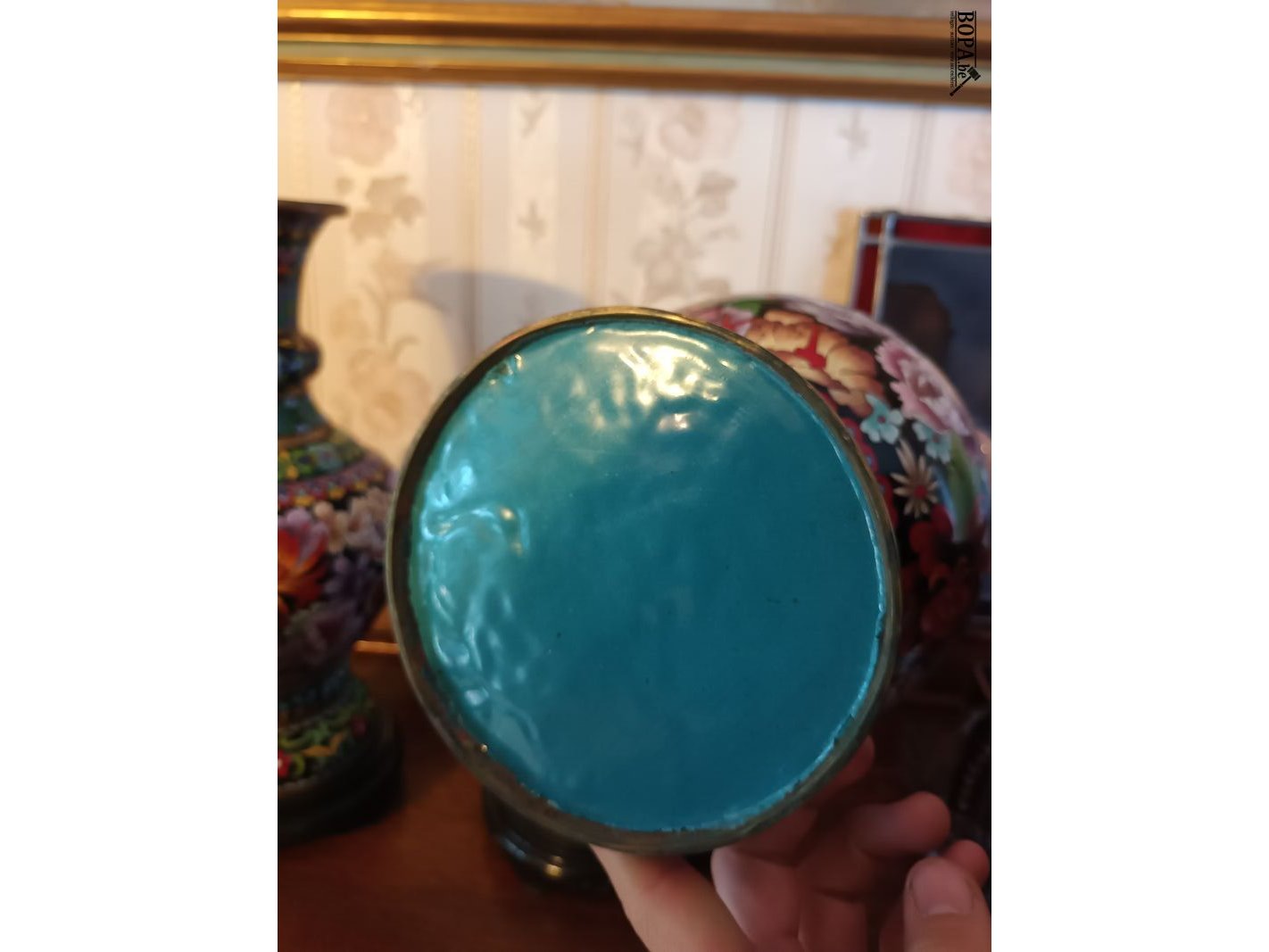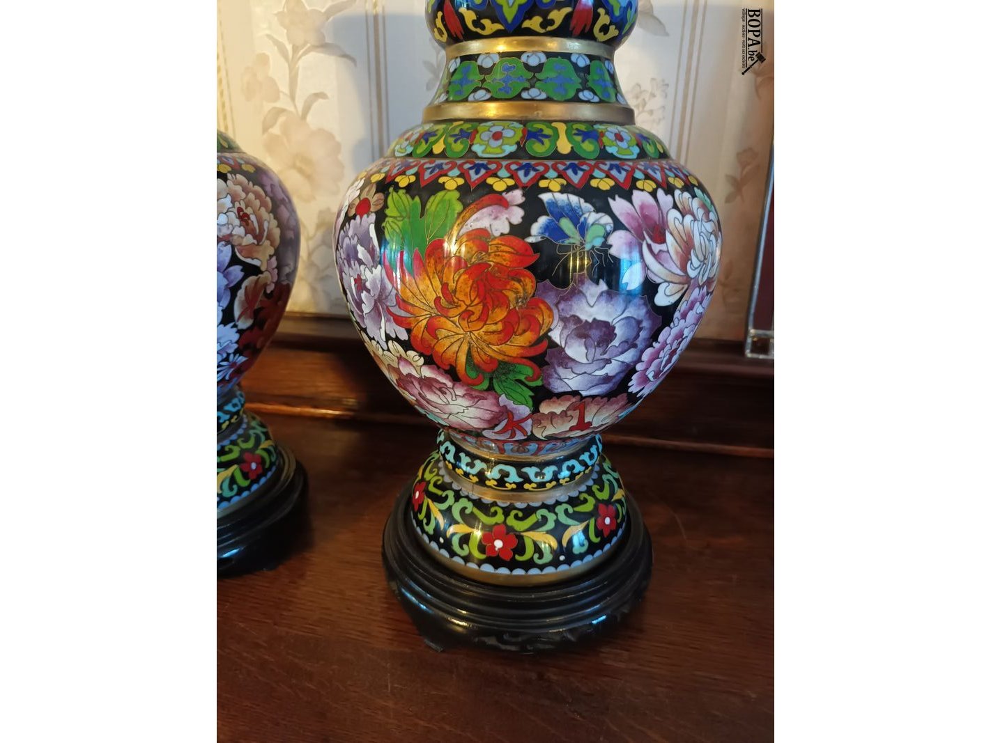 Koppel Chinese cloisonné vazen op houten sokkel. Hoogte 43 cm.
