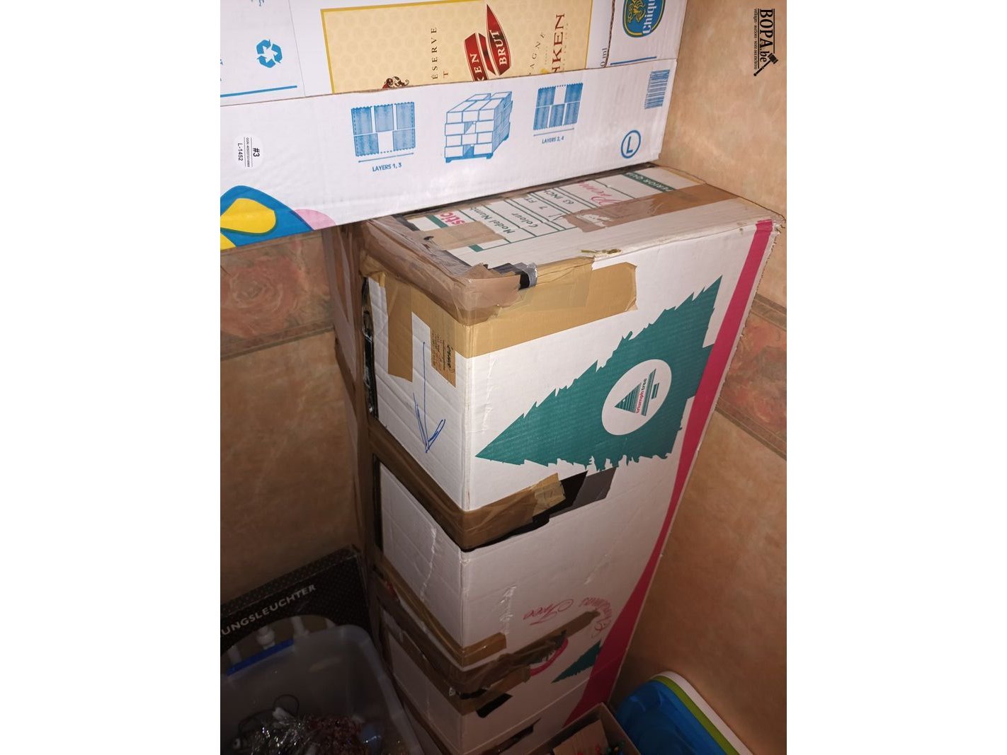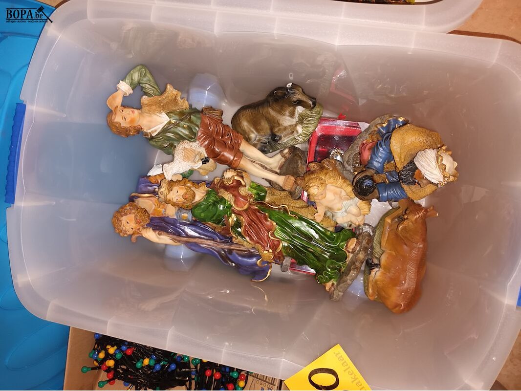 Kerstdecoratie. Kerstboom, doos met inhoud, 3 bakken met inhoud.