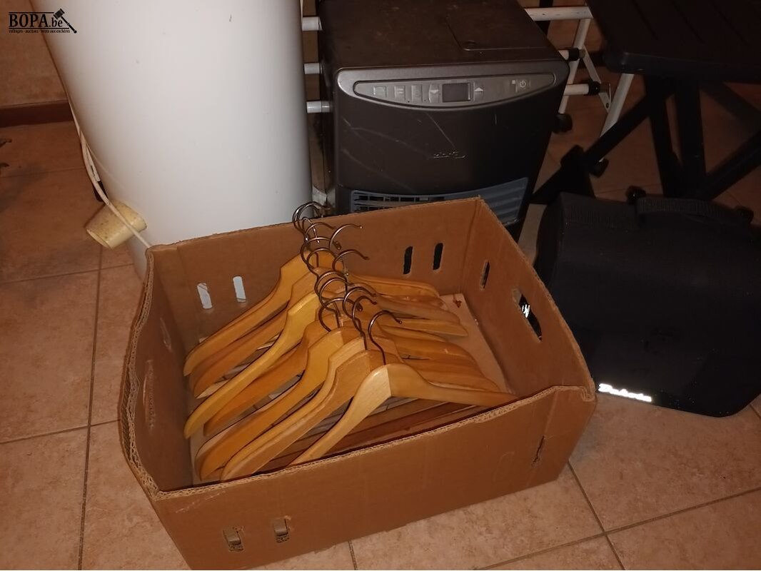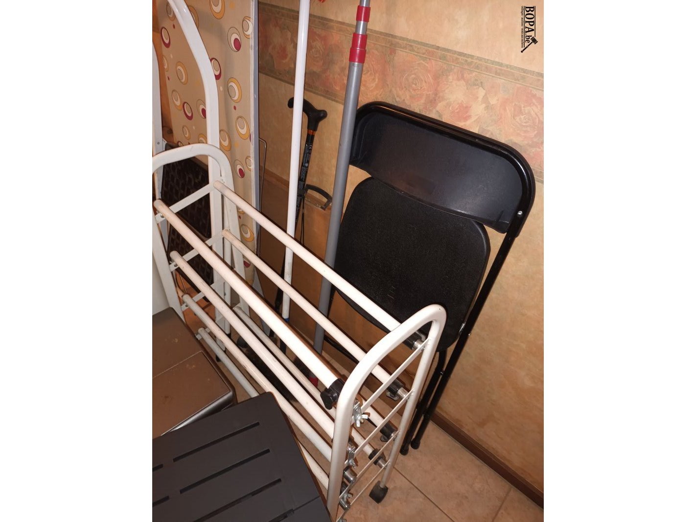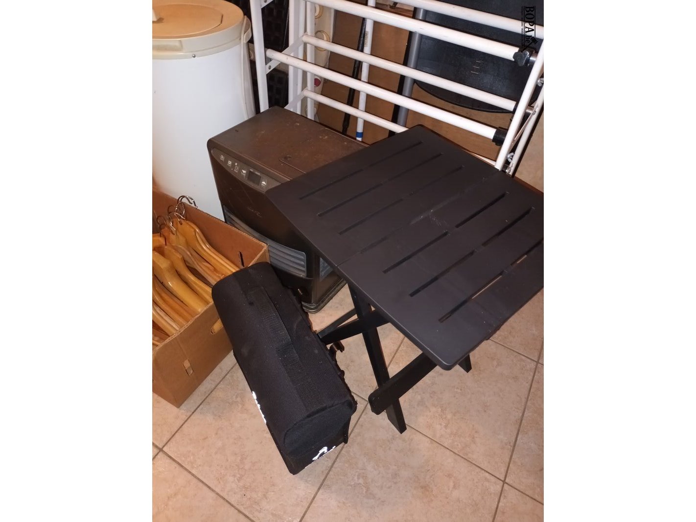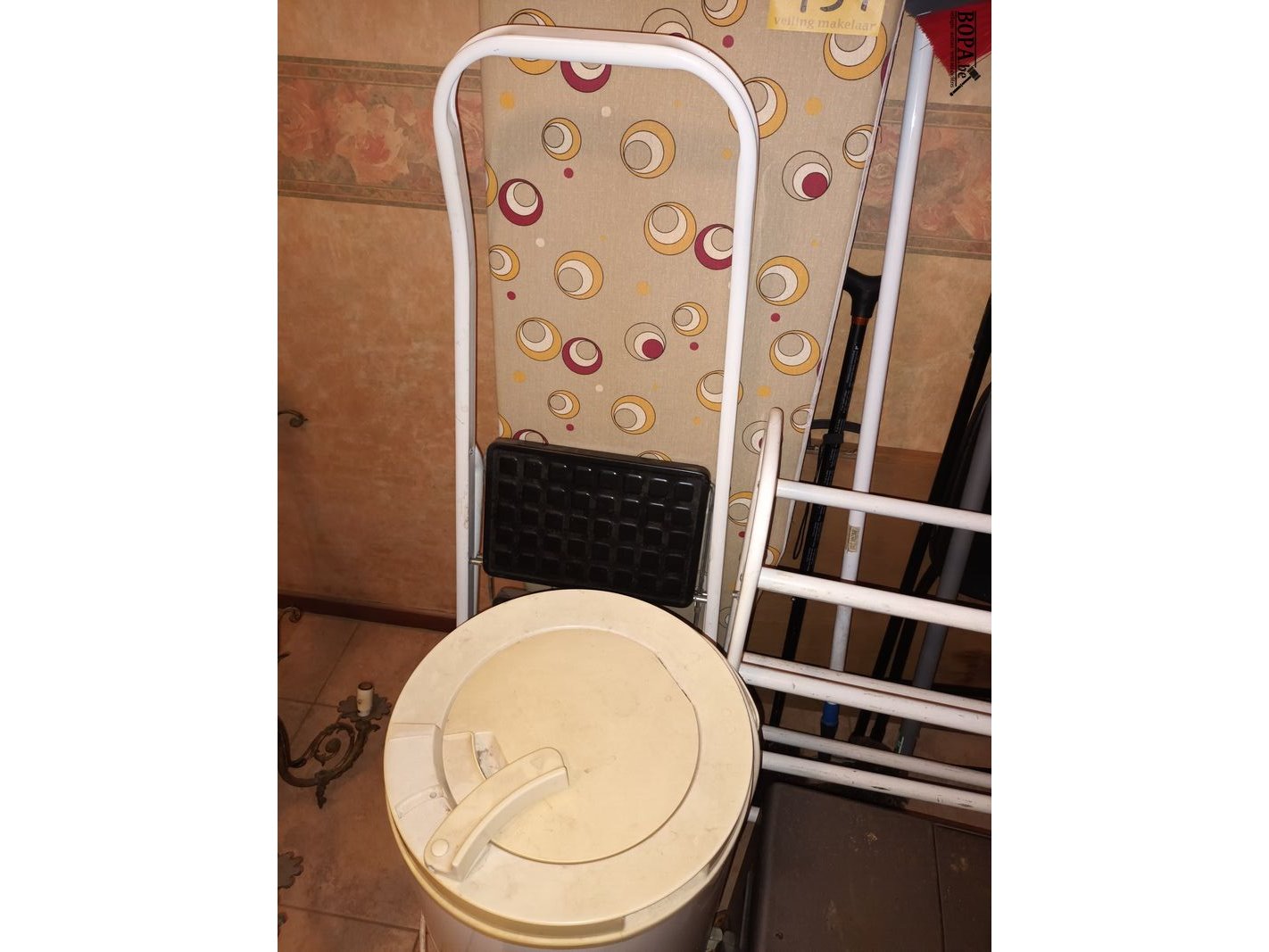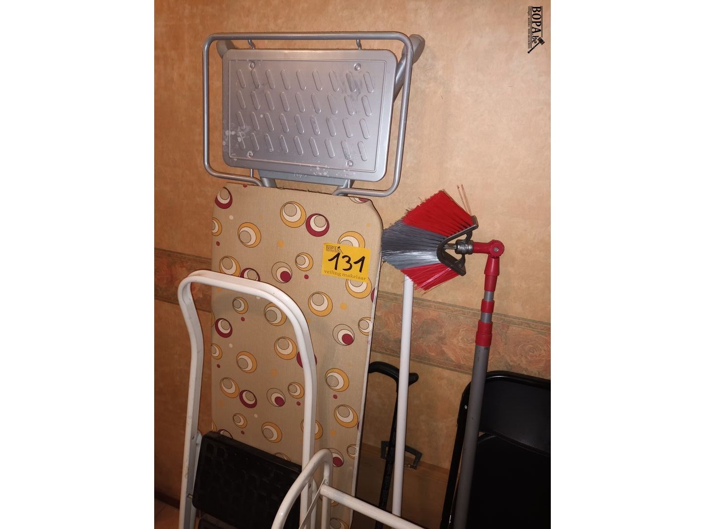 Lot huisraad. 13 stuks. Strijkplank, behangtafel, trapladder, plooistoel, schoenenrek, 2 borstels, wandelstok, bijzettafeltje, zwierder Thomas, petroleumkachel, fietstas, doos met houten kapstokken.
