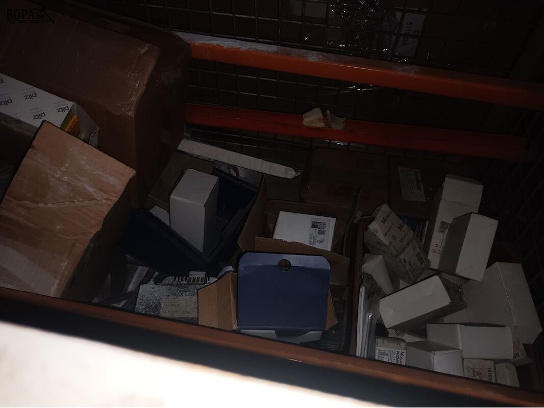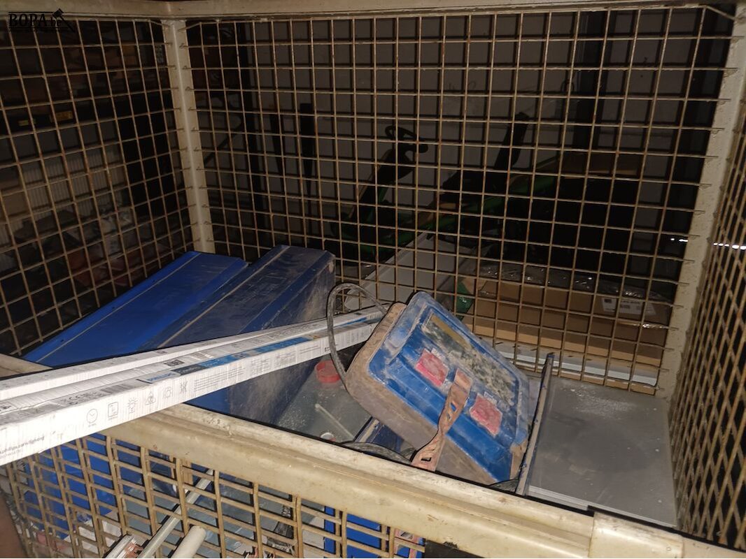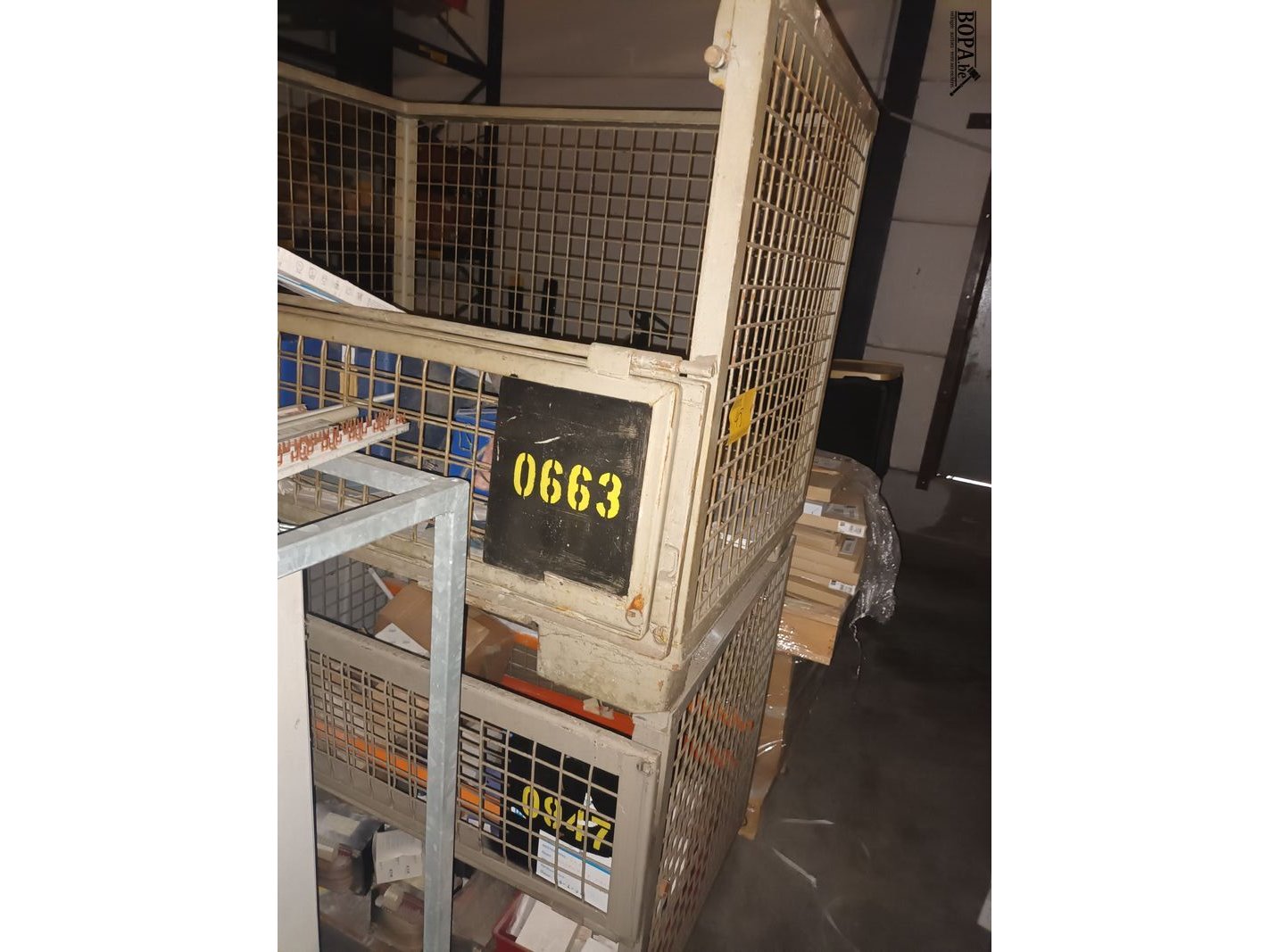 2 metalen stapelkooien ( 123 x 81 x 96 cm) met materiaal voor elektrische installaties.