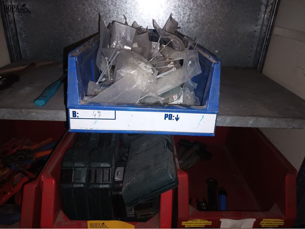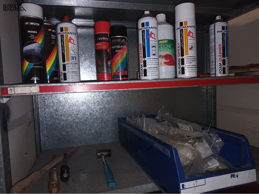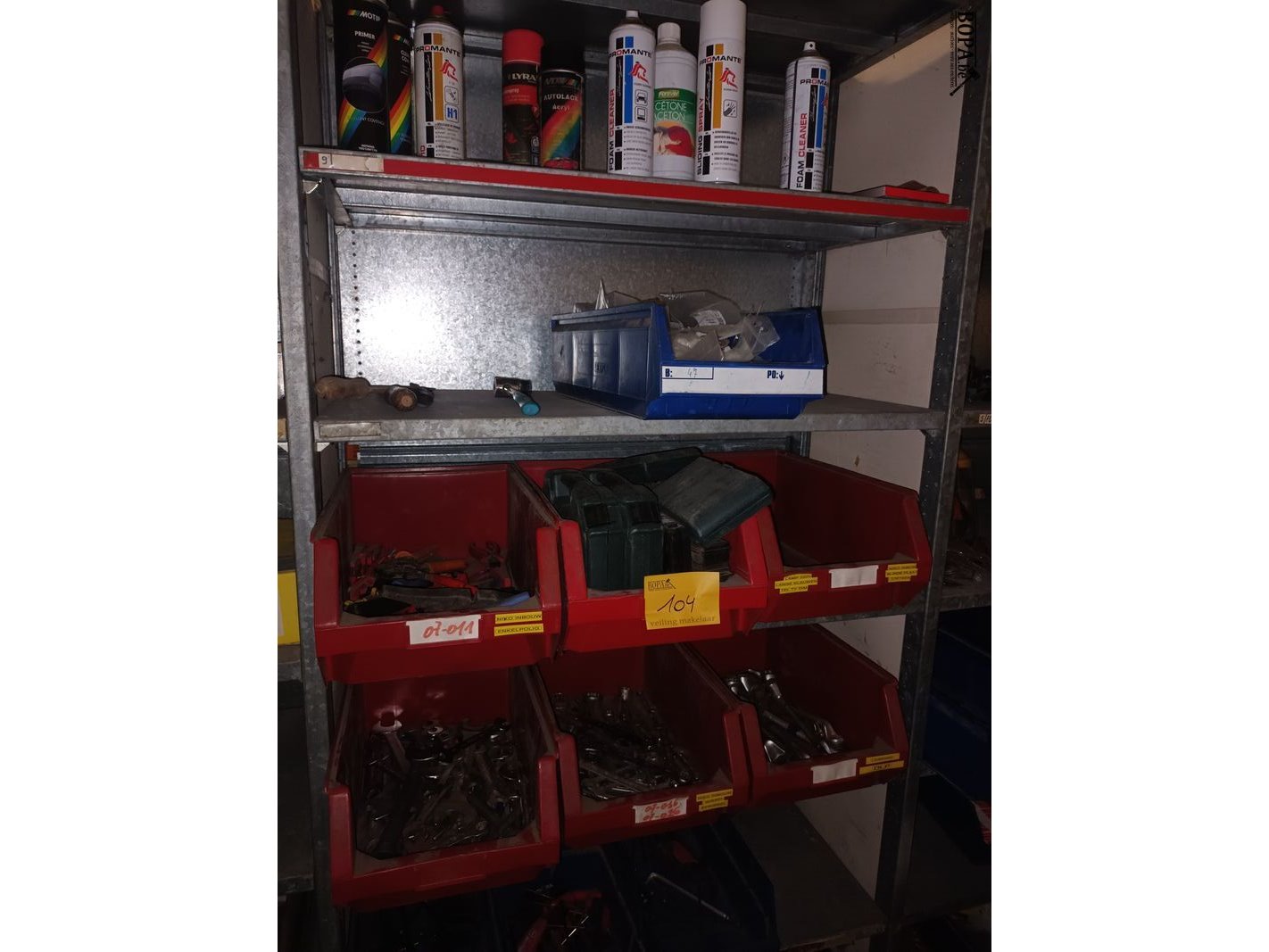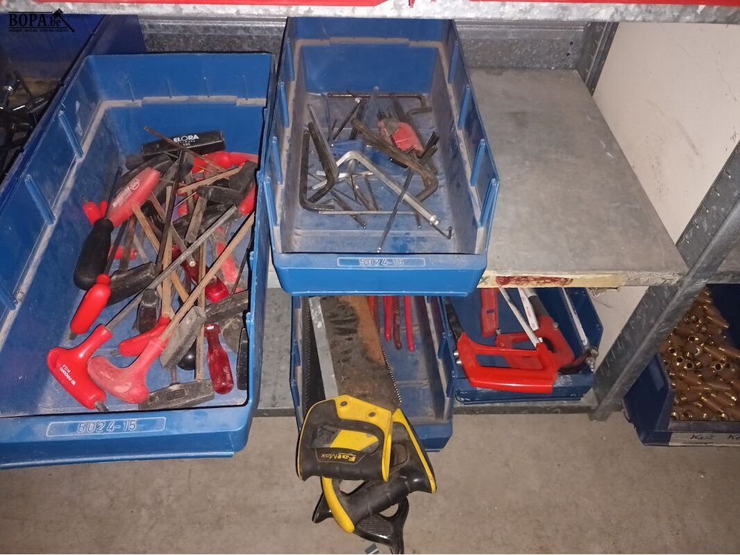 Handgereedschap zoals sleutels, zagen, schroevendraaiers en producten. Inhoud rek.