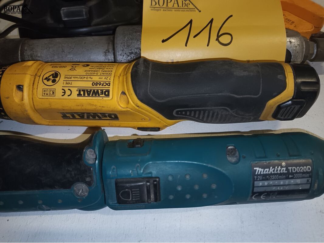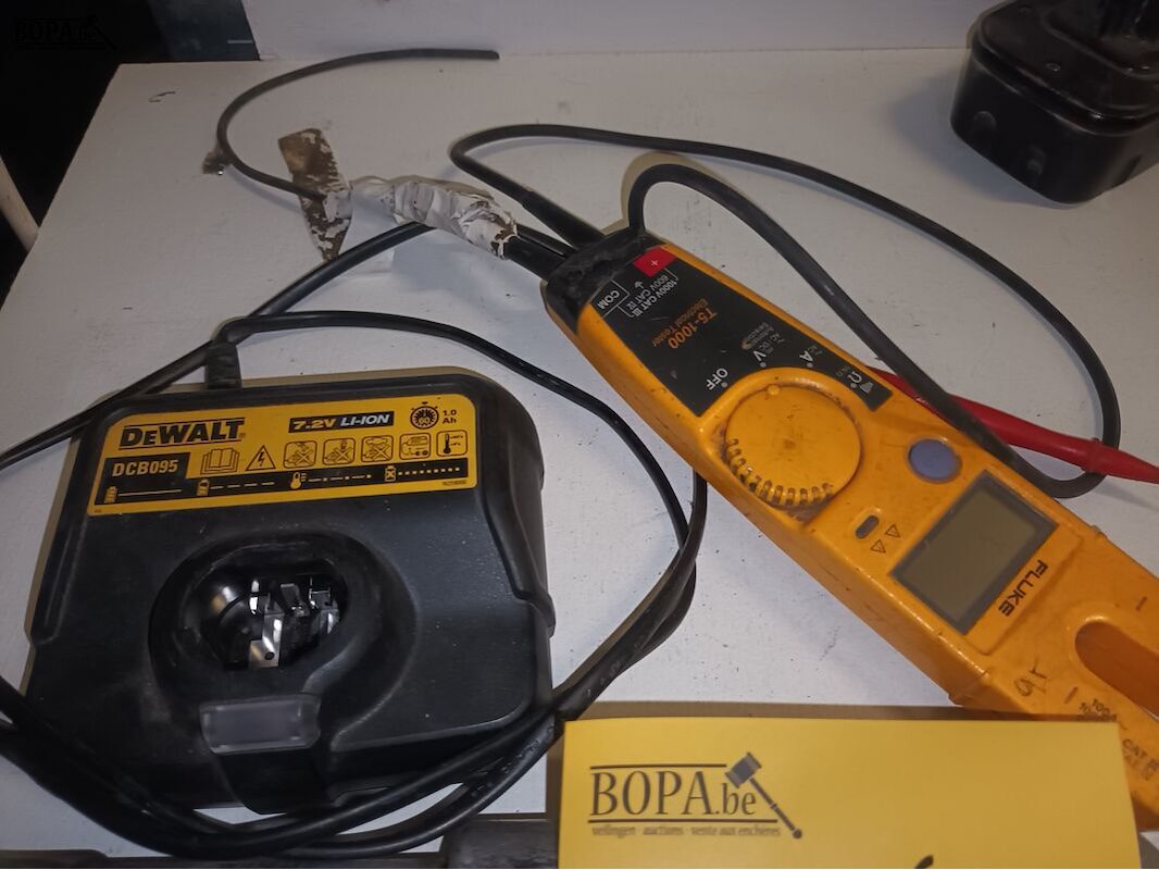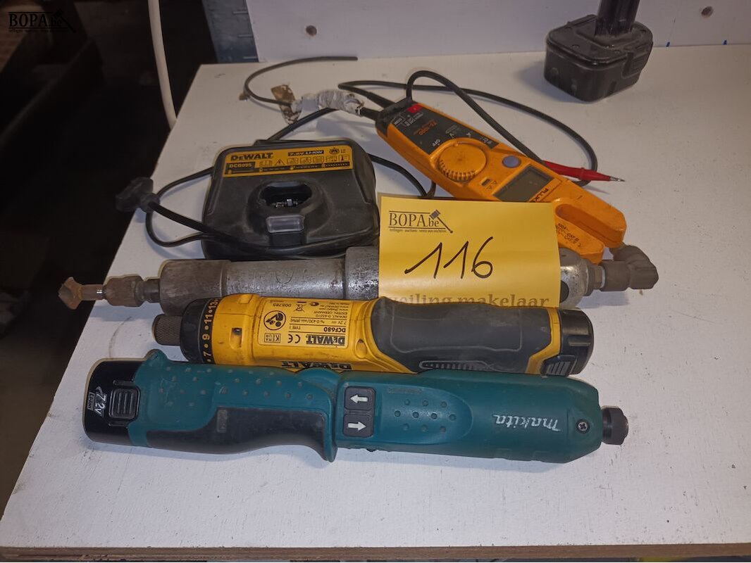 Divers gereedschap. 5 stuks. Flux meettoestel, Dewalt batterijlader en batterij, schroefmachine Dewalt en Makita.