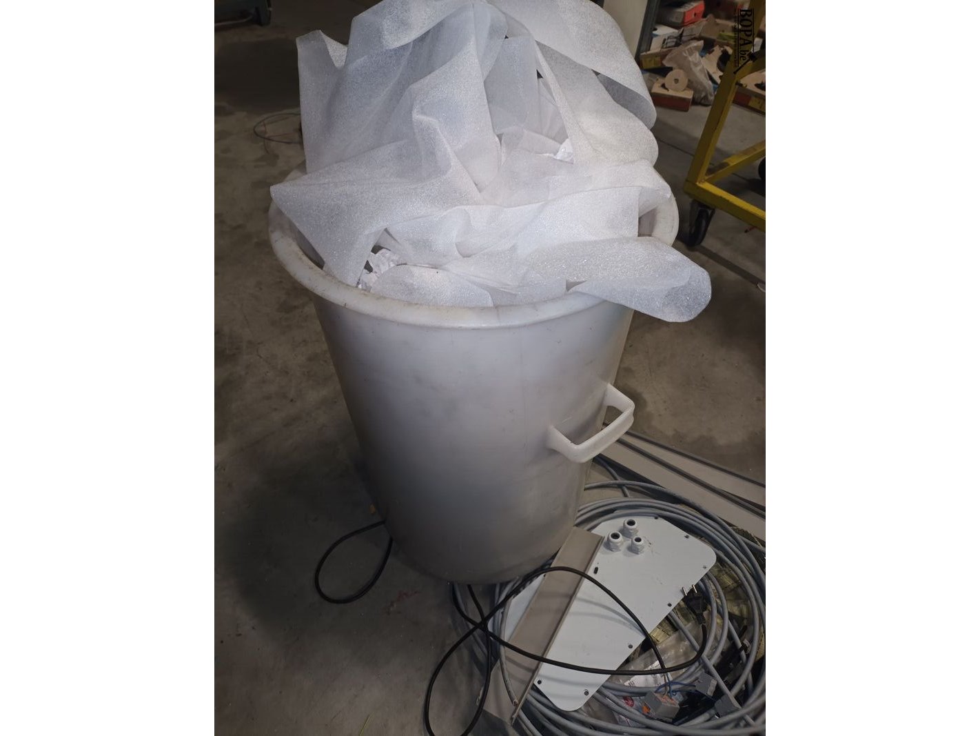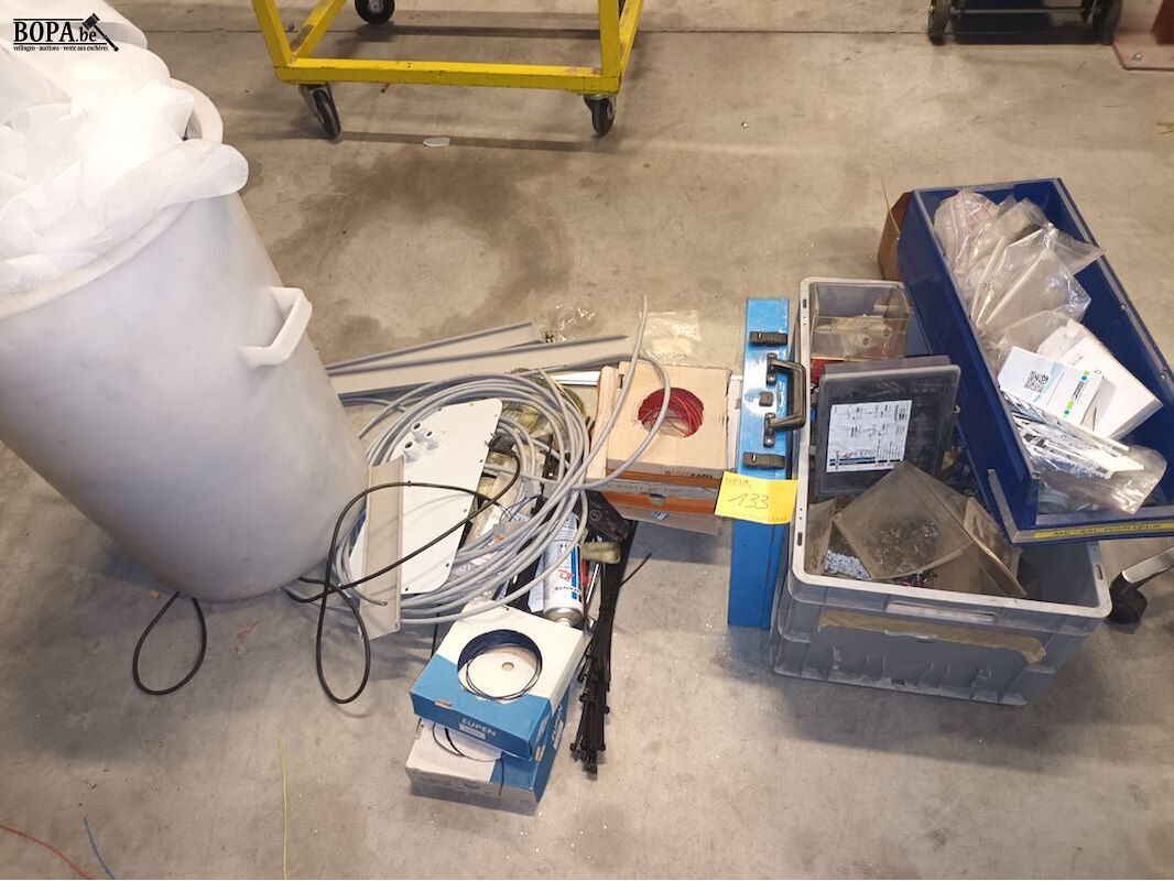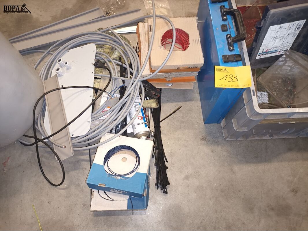 Lot diversen. Vuilnisbak, kabels, werkmateriaal.
