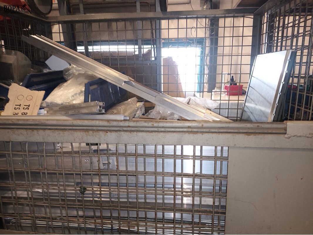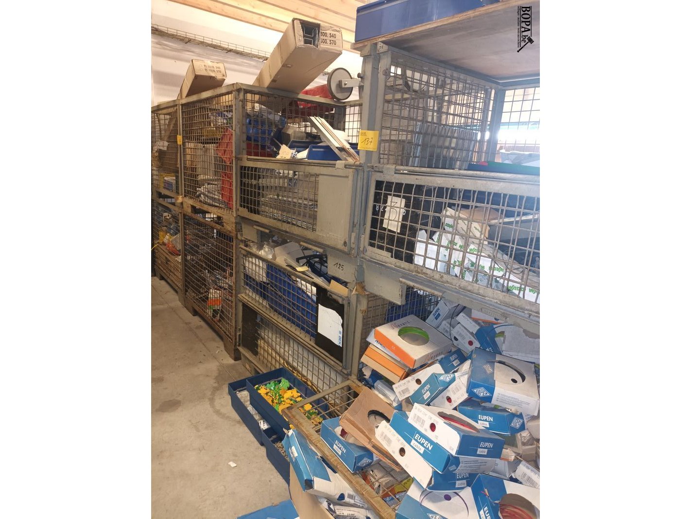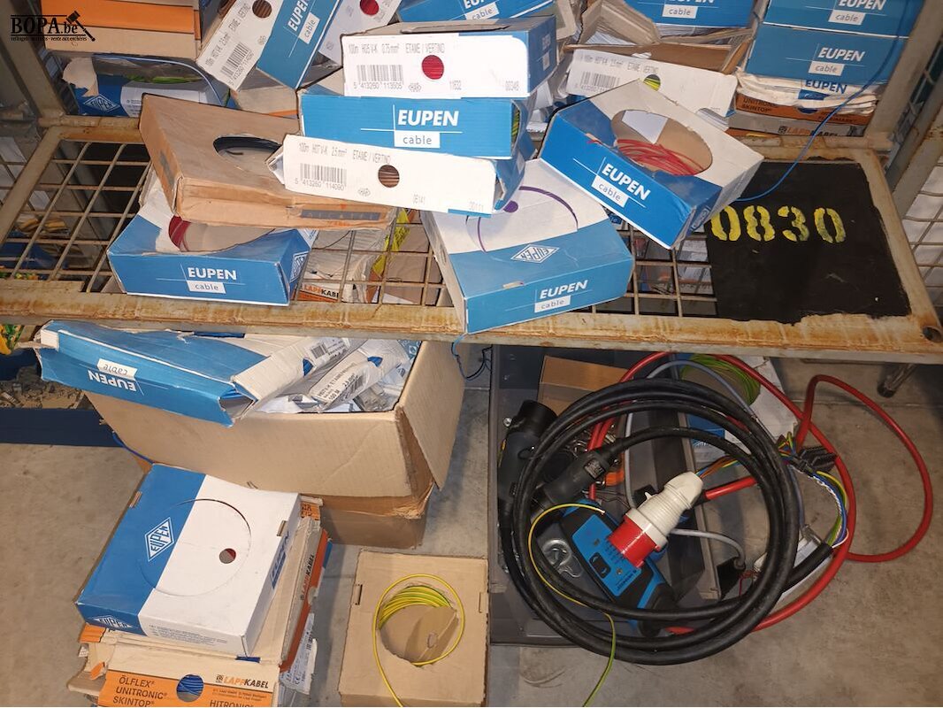 4 metalen stapelkooien met materiaal voor elektrische installaties.