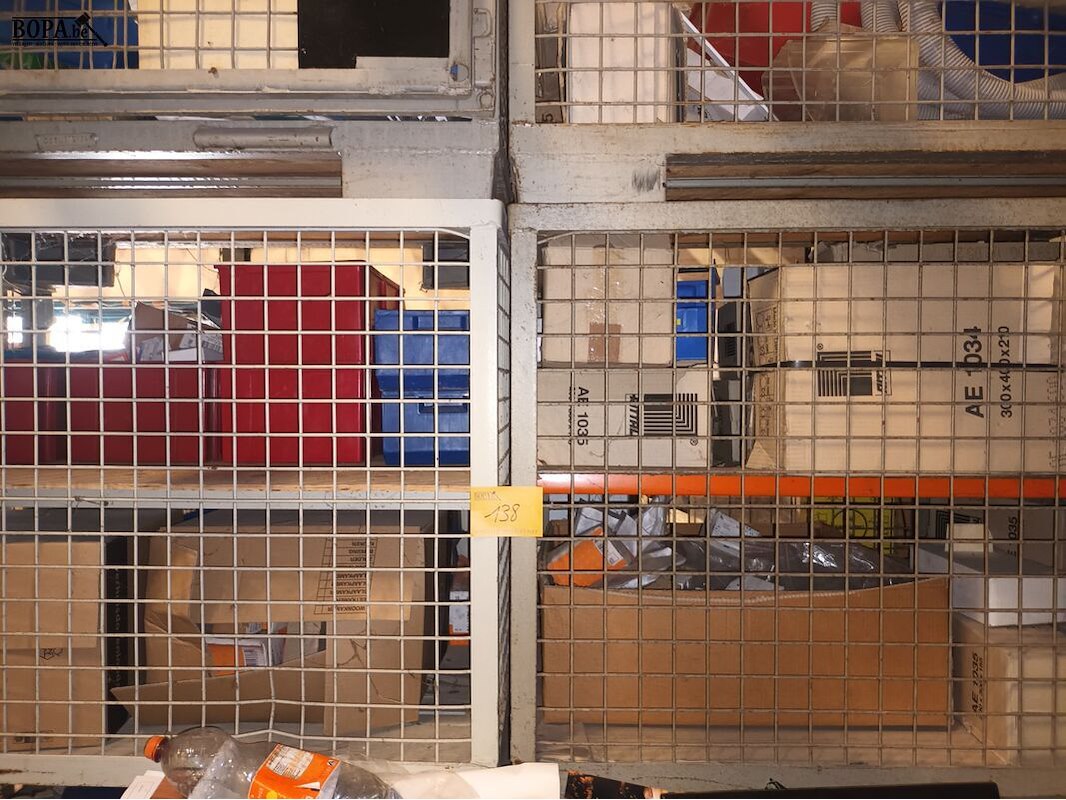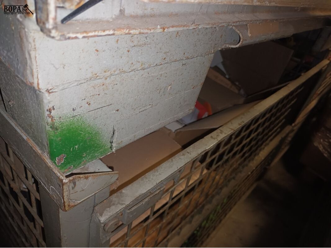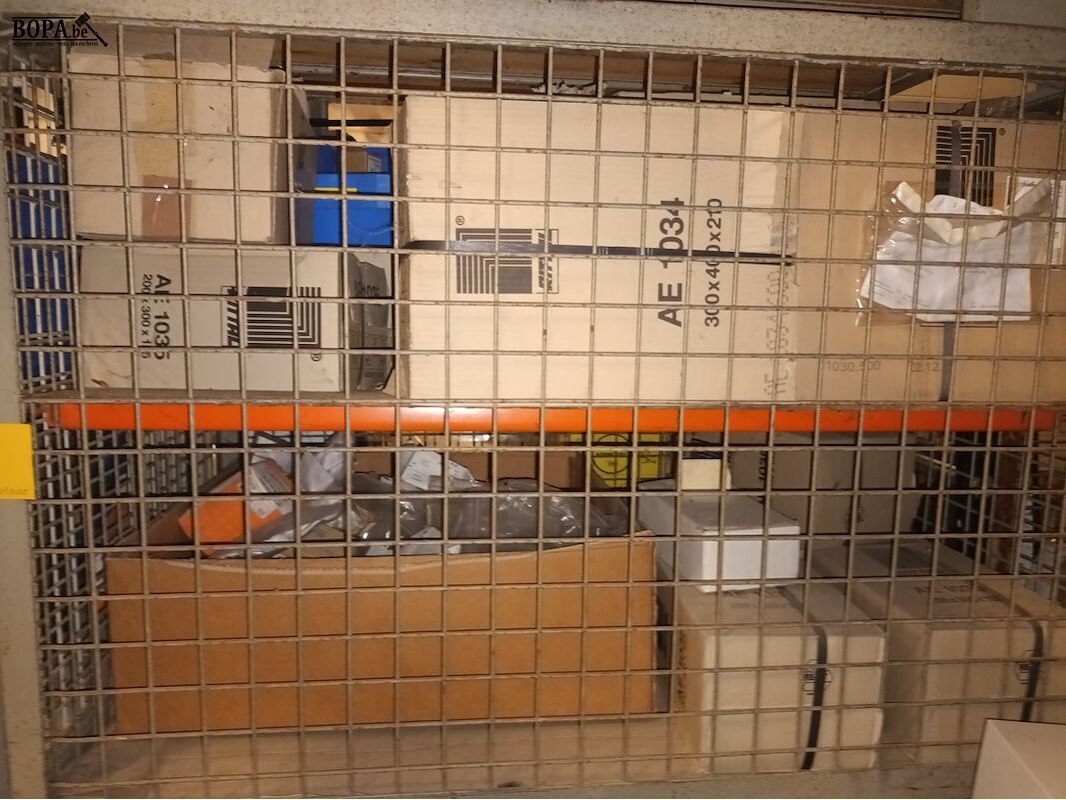 6 metalen stapelkooien met materiaal voor elektrische installaties.