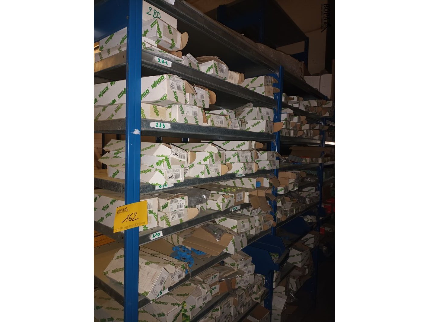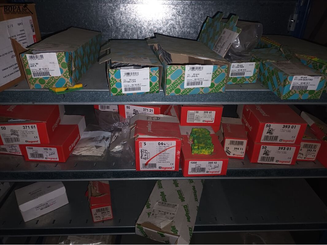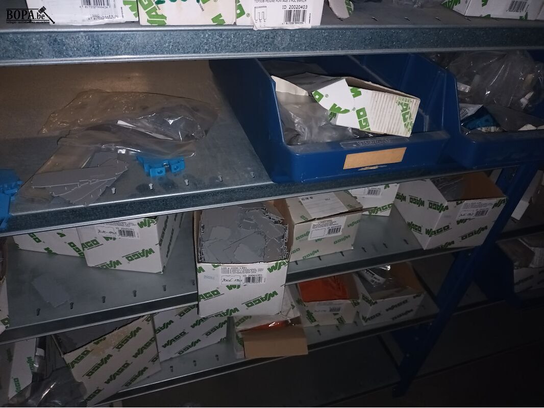 Blauw magazijnrek (660 x 50 x 200 cm) met inhoud zoals Wago klemmen en Legrand klemmen.