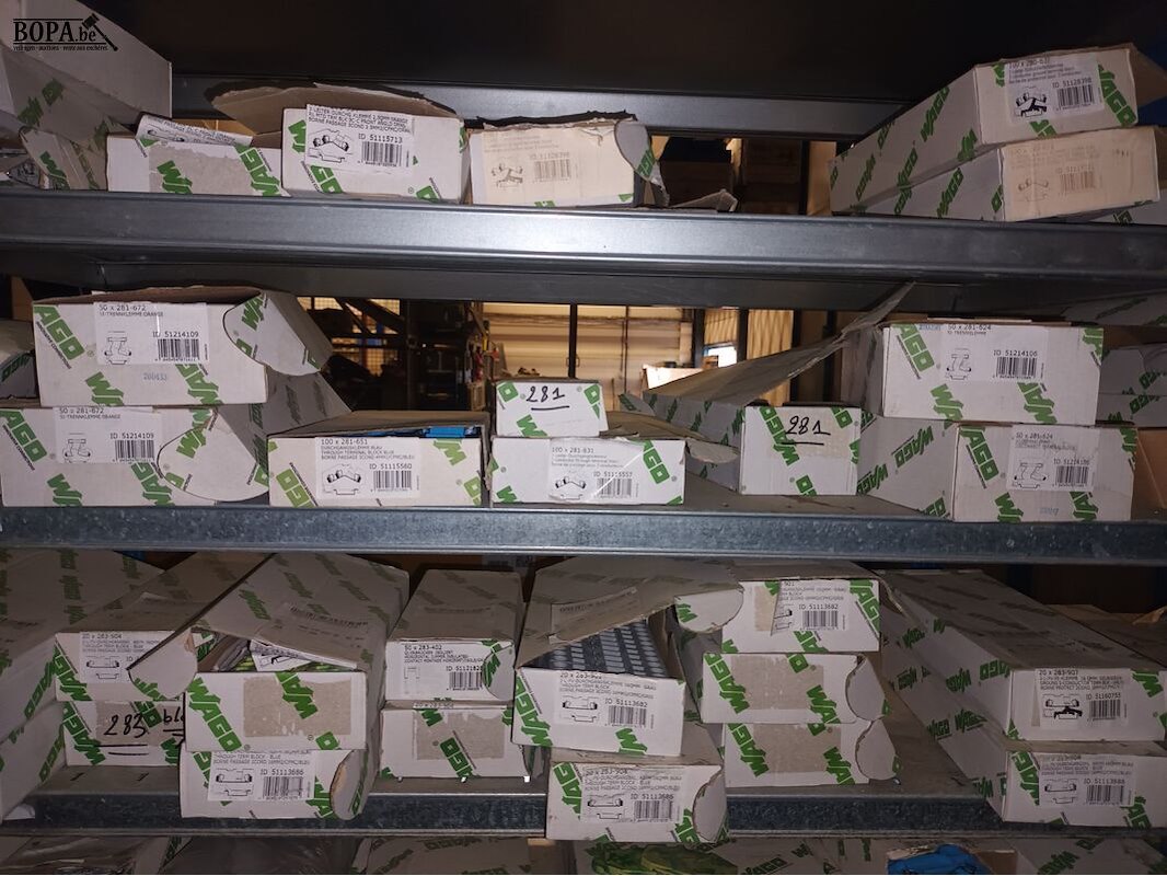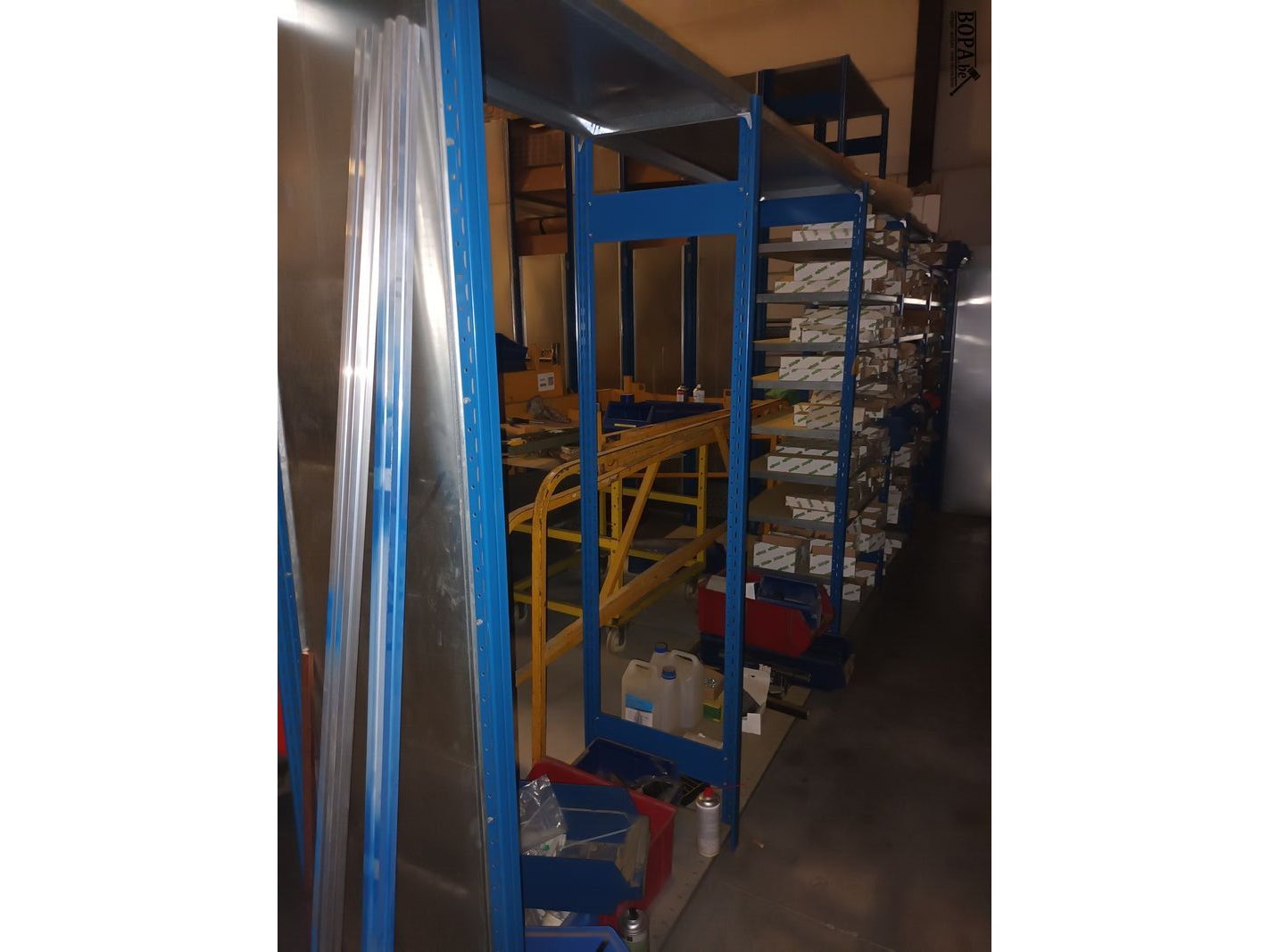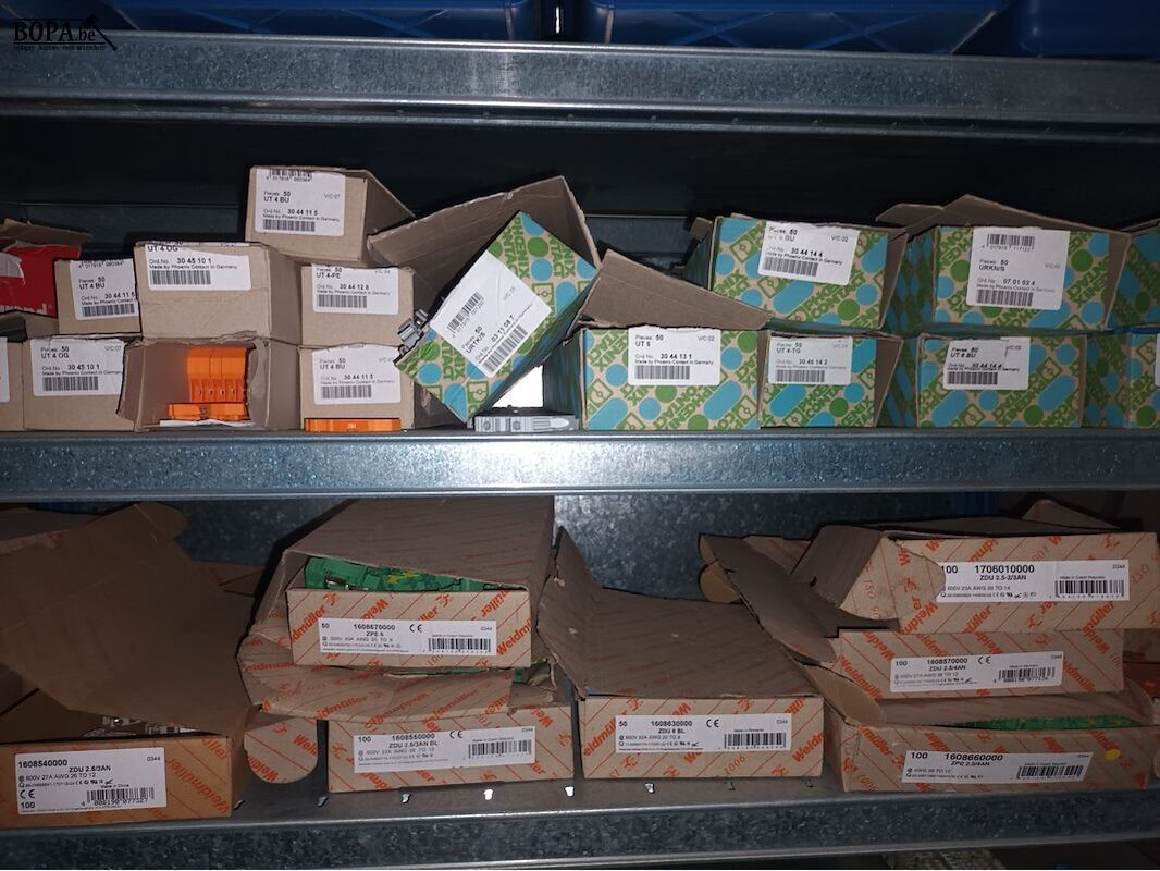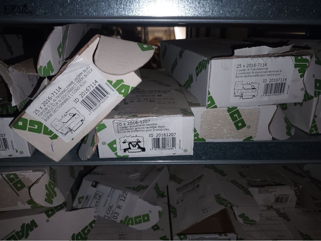 Blauw magazijnrek (660 x 50 x 200 cm) met inhoud zoals Wago klemmen en Legrand klemmen.