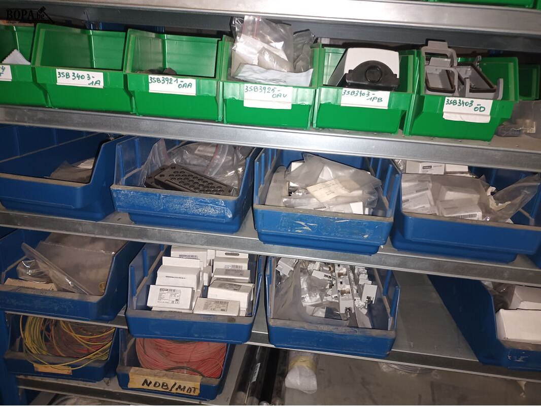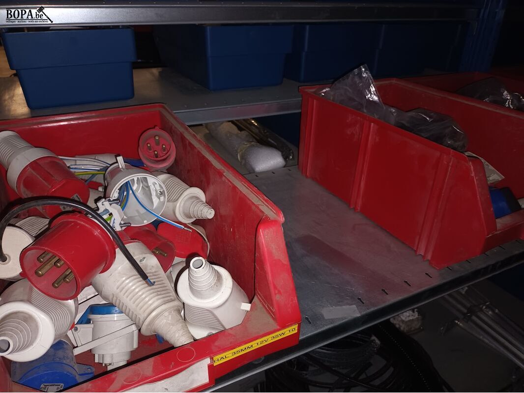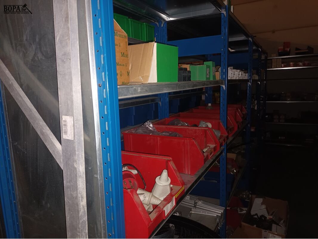 Blauw magazijnrek (455 x 100 x 200 cm) met materiaal voor elektrische installaties.