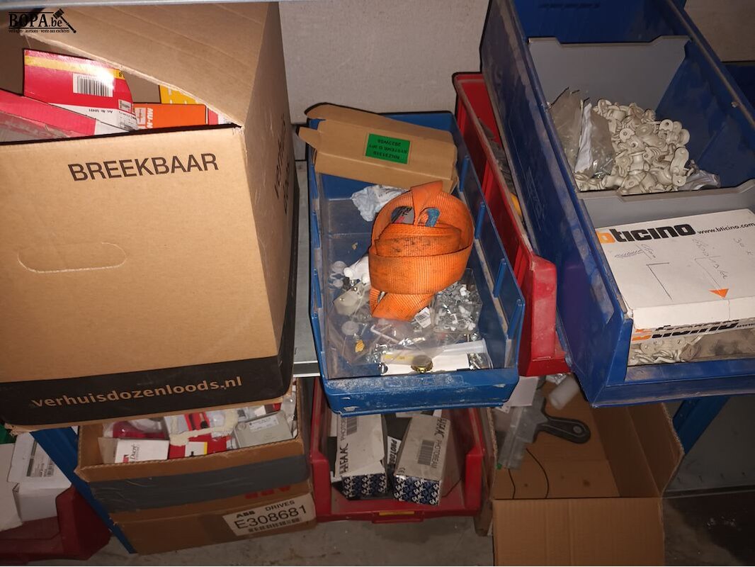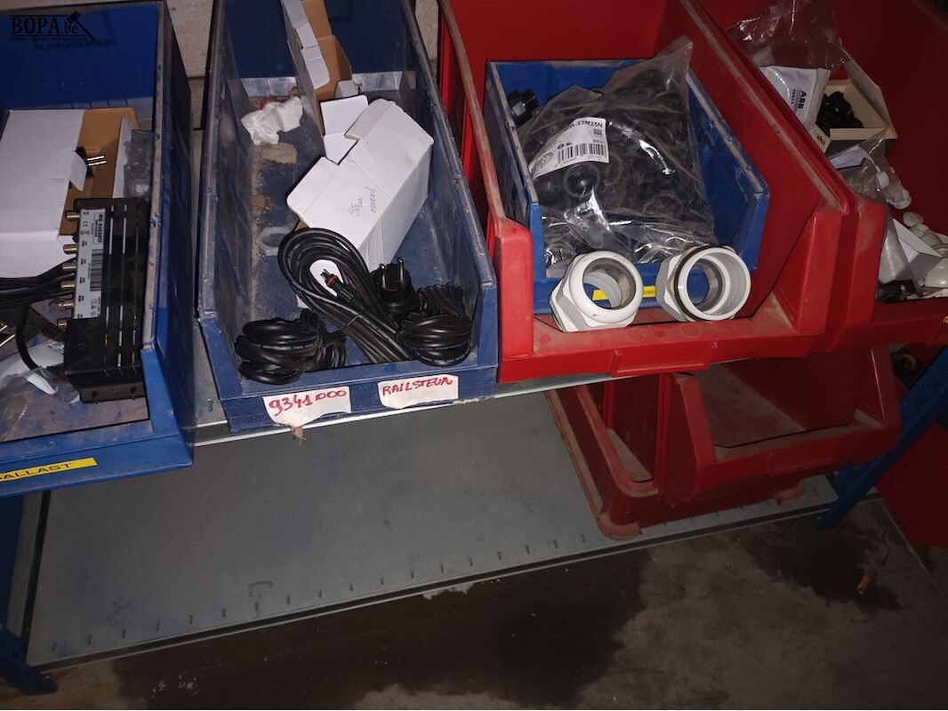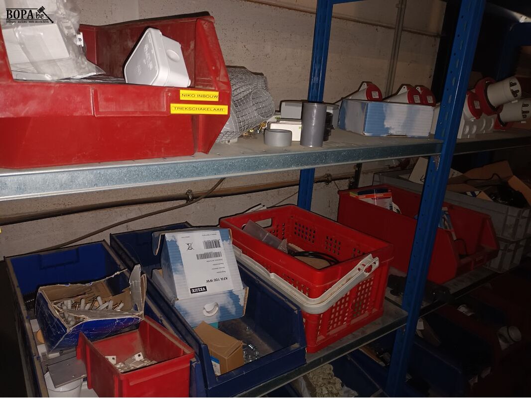Blauw magazijnrek (640 x 50 x 200 cm) met materiaal voor elektrische installaties.