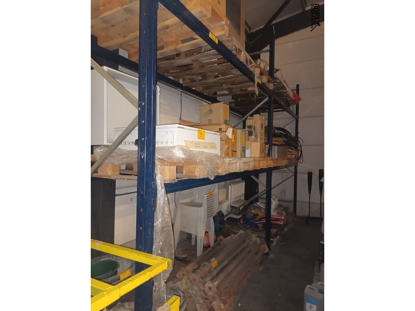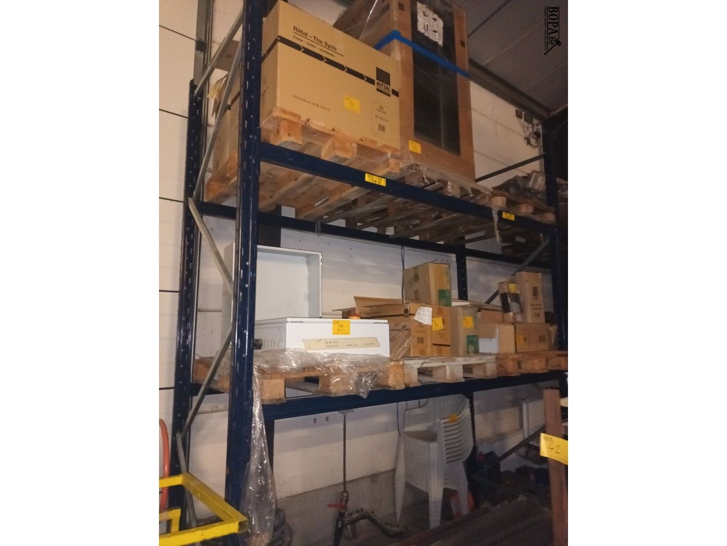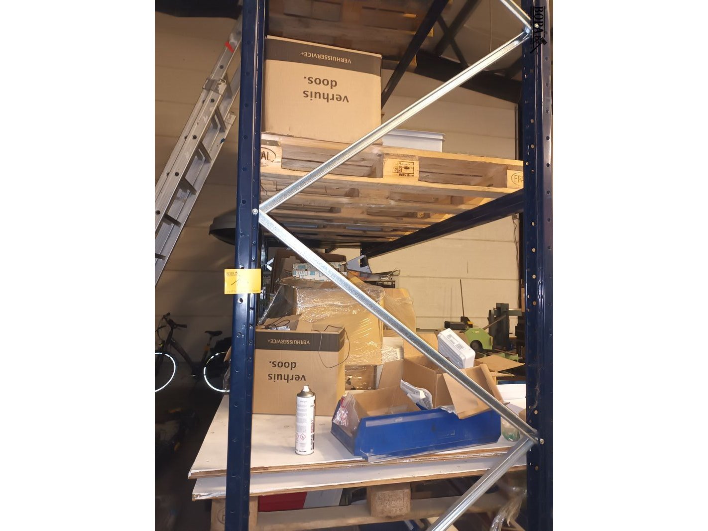 Blauw magazijnrek. 1 rek met 3 staanders van 110 x 350 cm en 8 liggers van 272 cm en 1 rek met 3 staanders van 110 x 350 cm en 12 liggers van 272 cm.