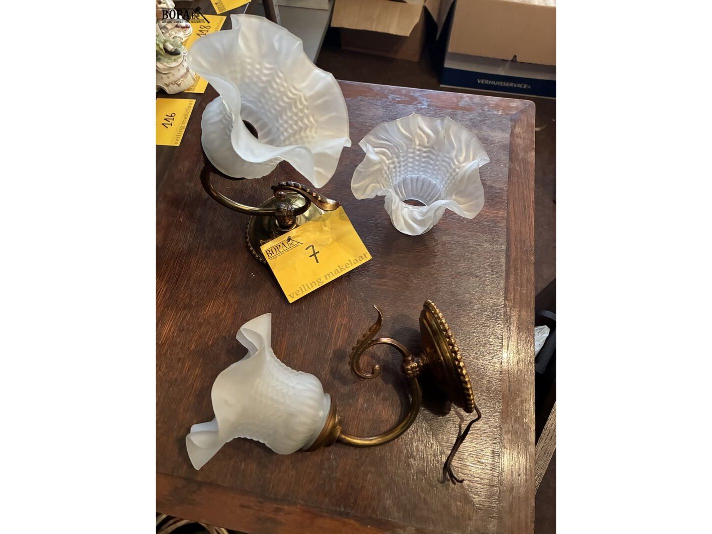 Lot 7 - wandlichten in koper melkglas, 2 stuks met 3 kapjes