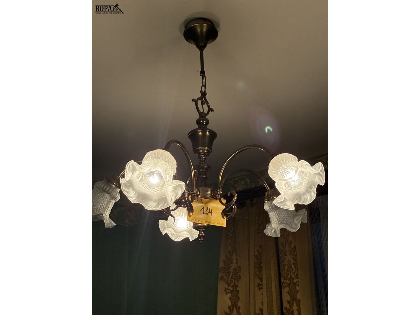 Luchter in koper met glazen kapjes, 5 armen