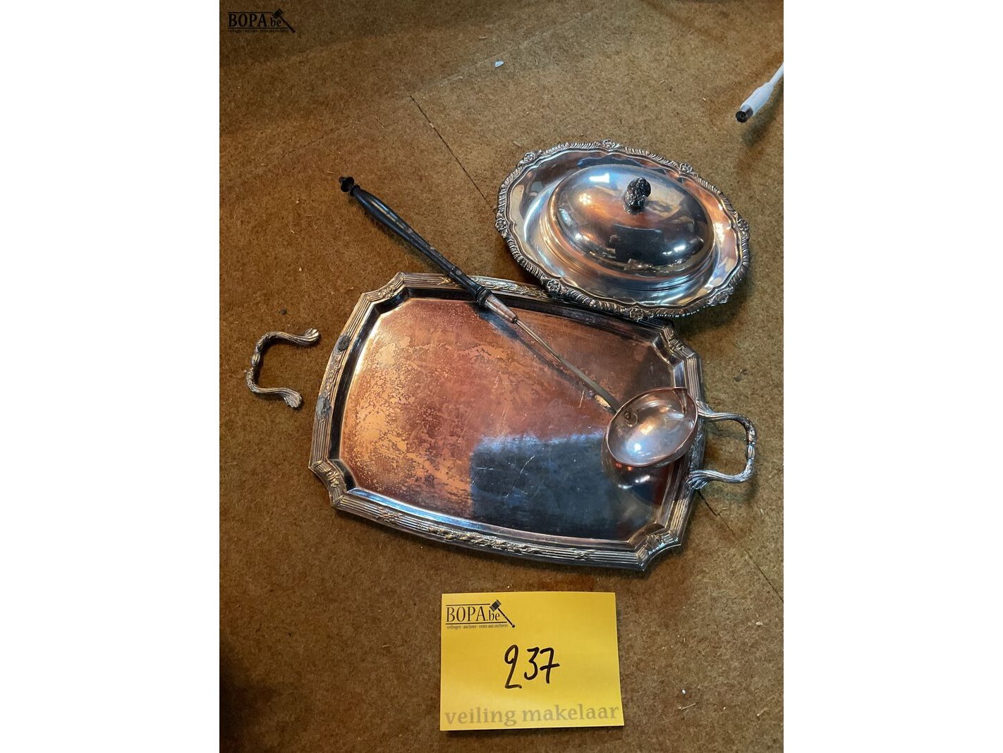 Lot 237 - verzilverd dienblad/opscheplepel houten handvat/boterstolp