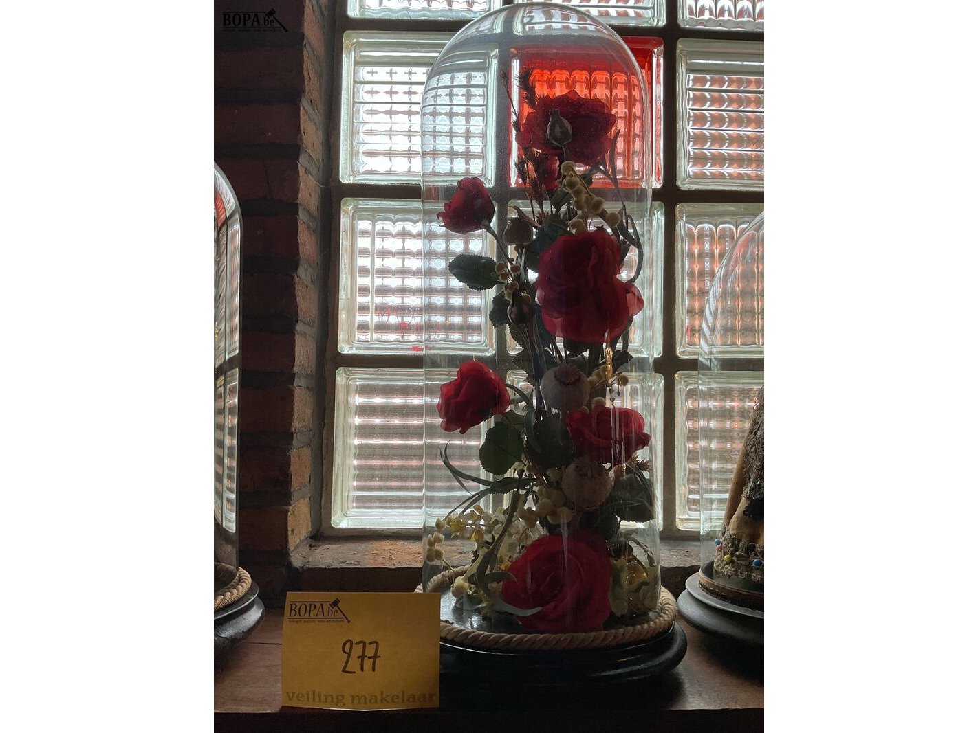 Lot 277 - glazen stolp op voet met bloemen in zijde