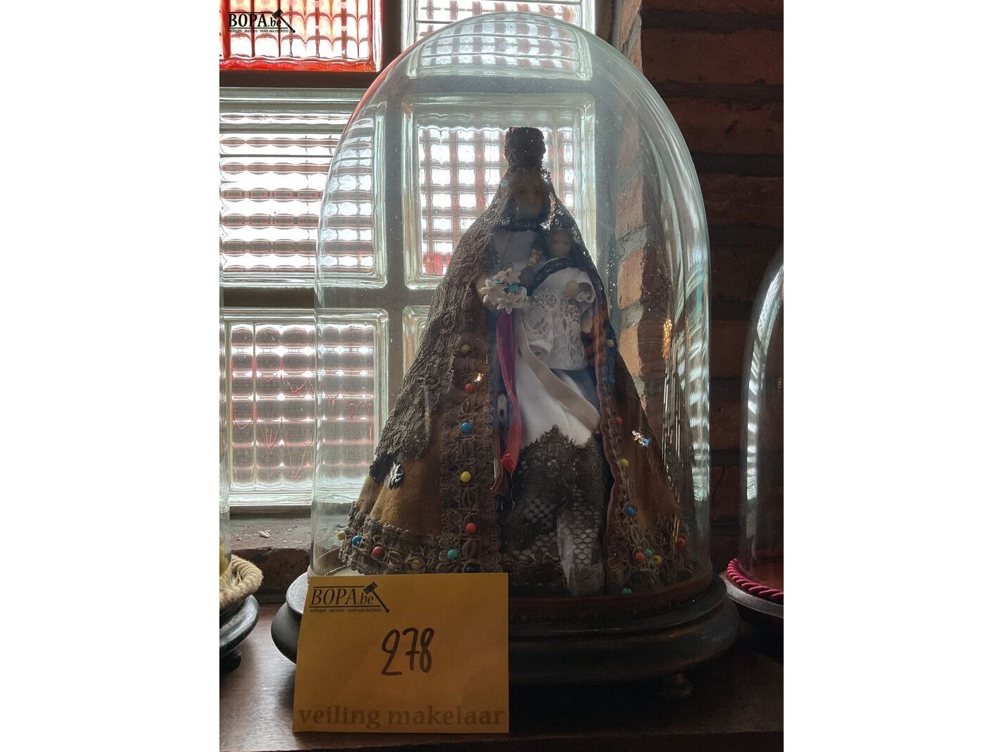 Lot 278 - ovaal glazen stolp met inhoud mariabeeldje