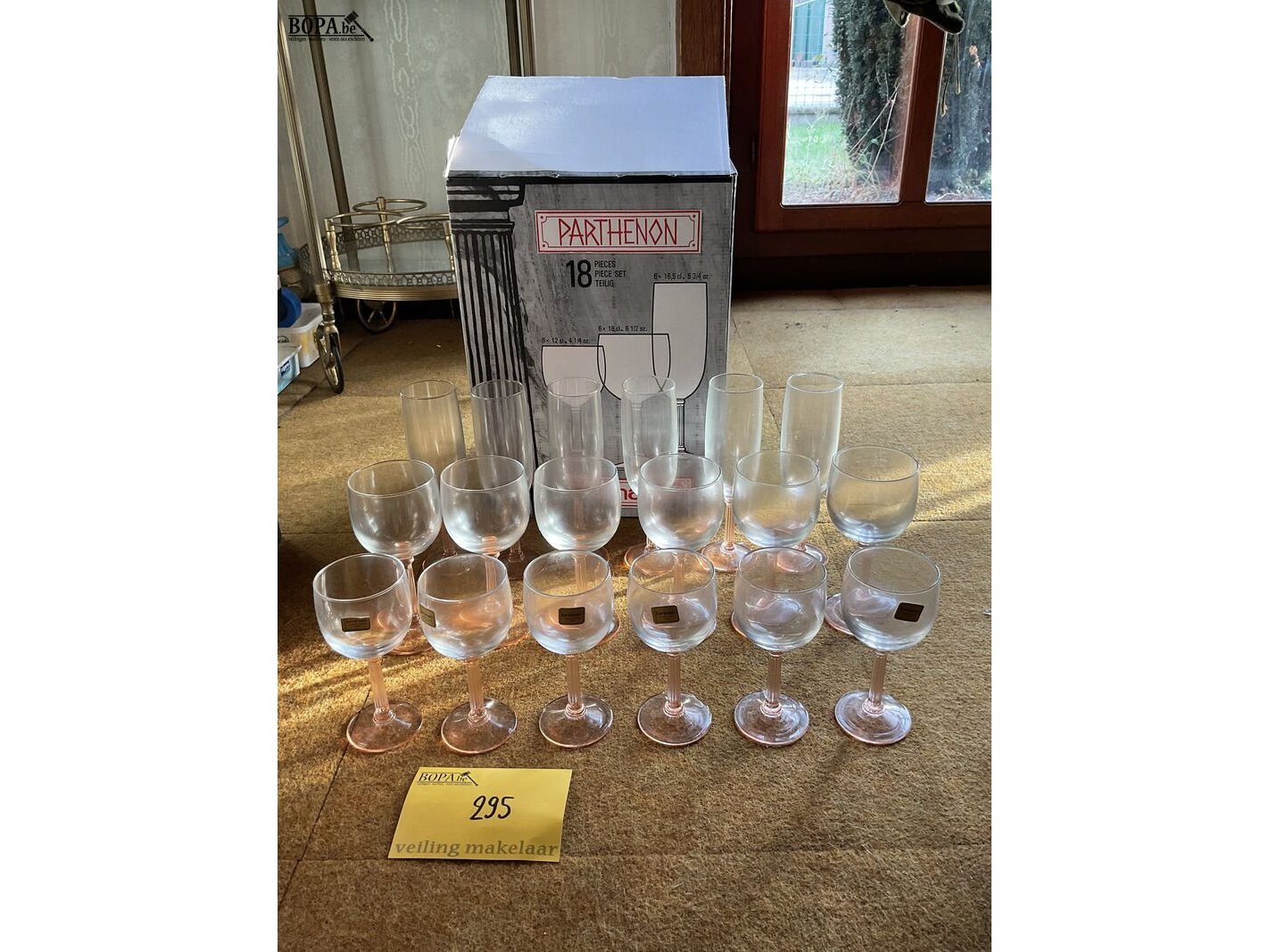 Lot 295 - glazen 18-delige set op roze voet luminarc