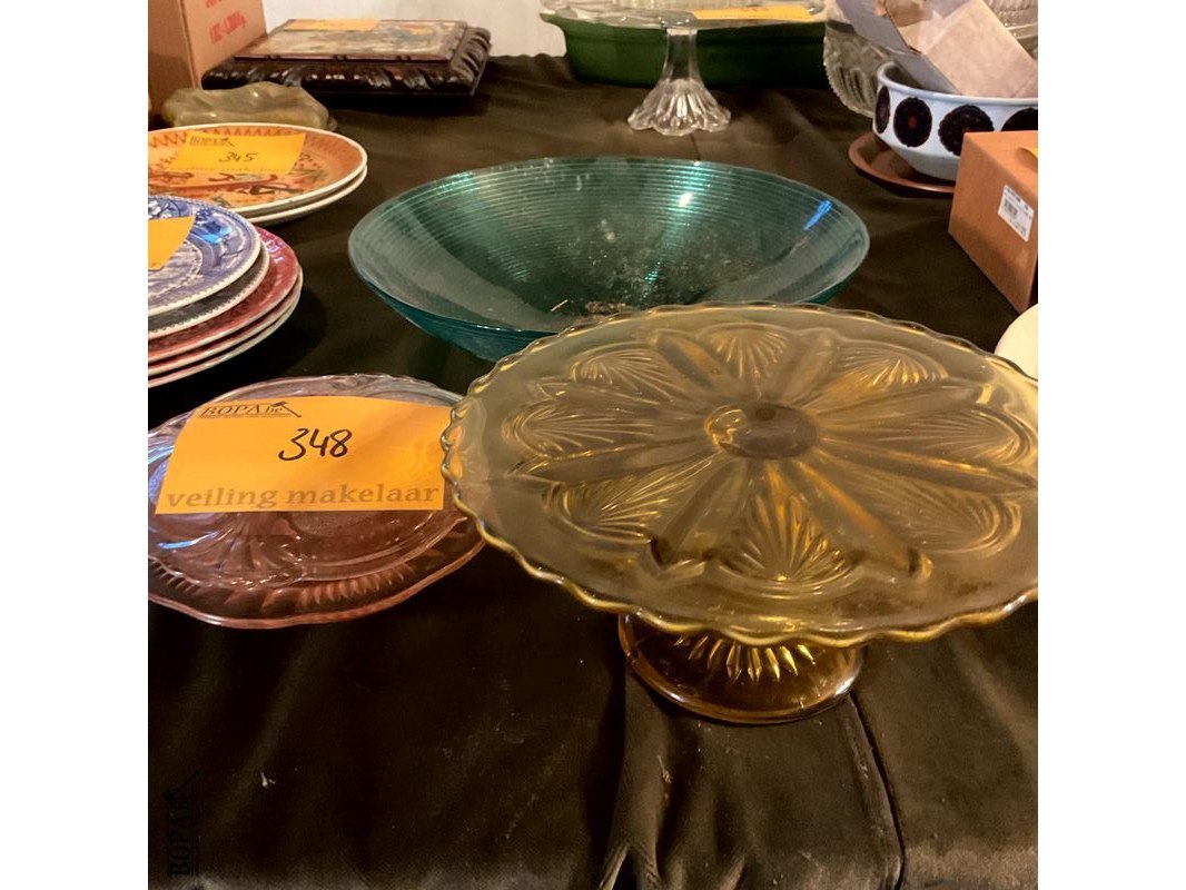 Lot 348 - glazen schalen/boterpot roze glas/taartstatief op voet, 3 st