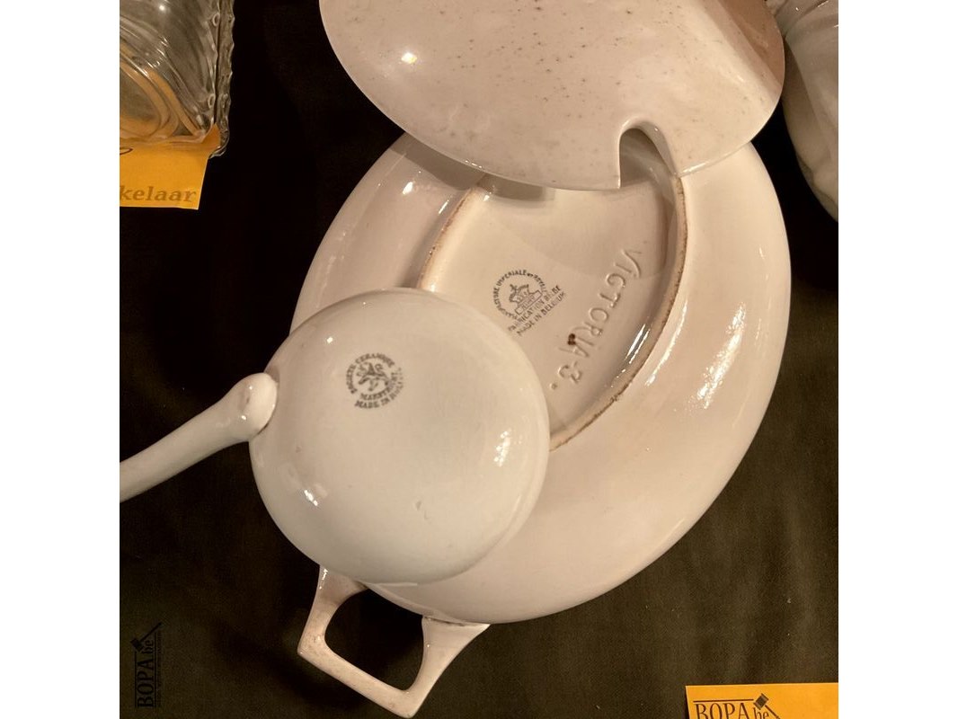 Ovalen porselein wit VICTORIA opdienschotel + deksel en opscheplepel/kleine witte kom, 3 stuks in totaal