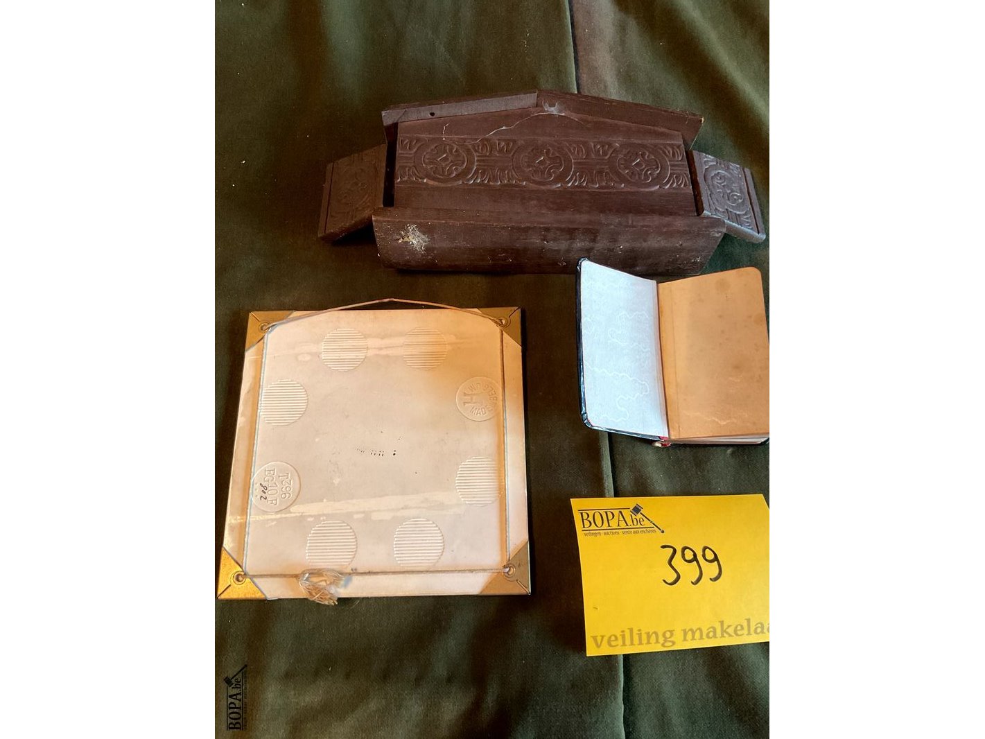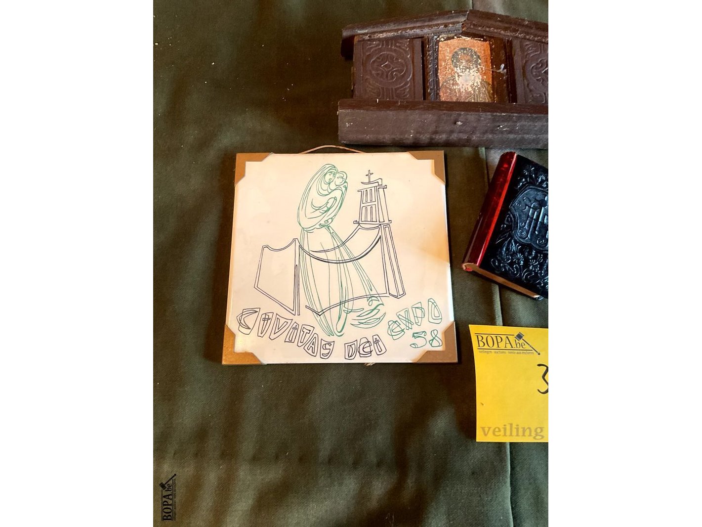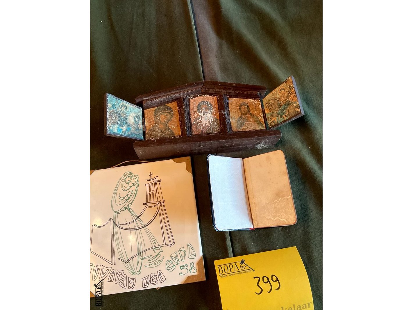 Lot 399 - expo 58 tegeltje/kerkboekje/kapelletje hout, 3 stuks