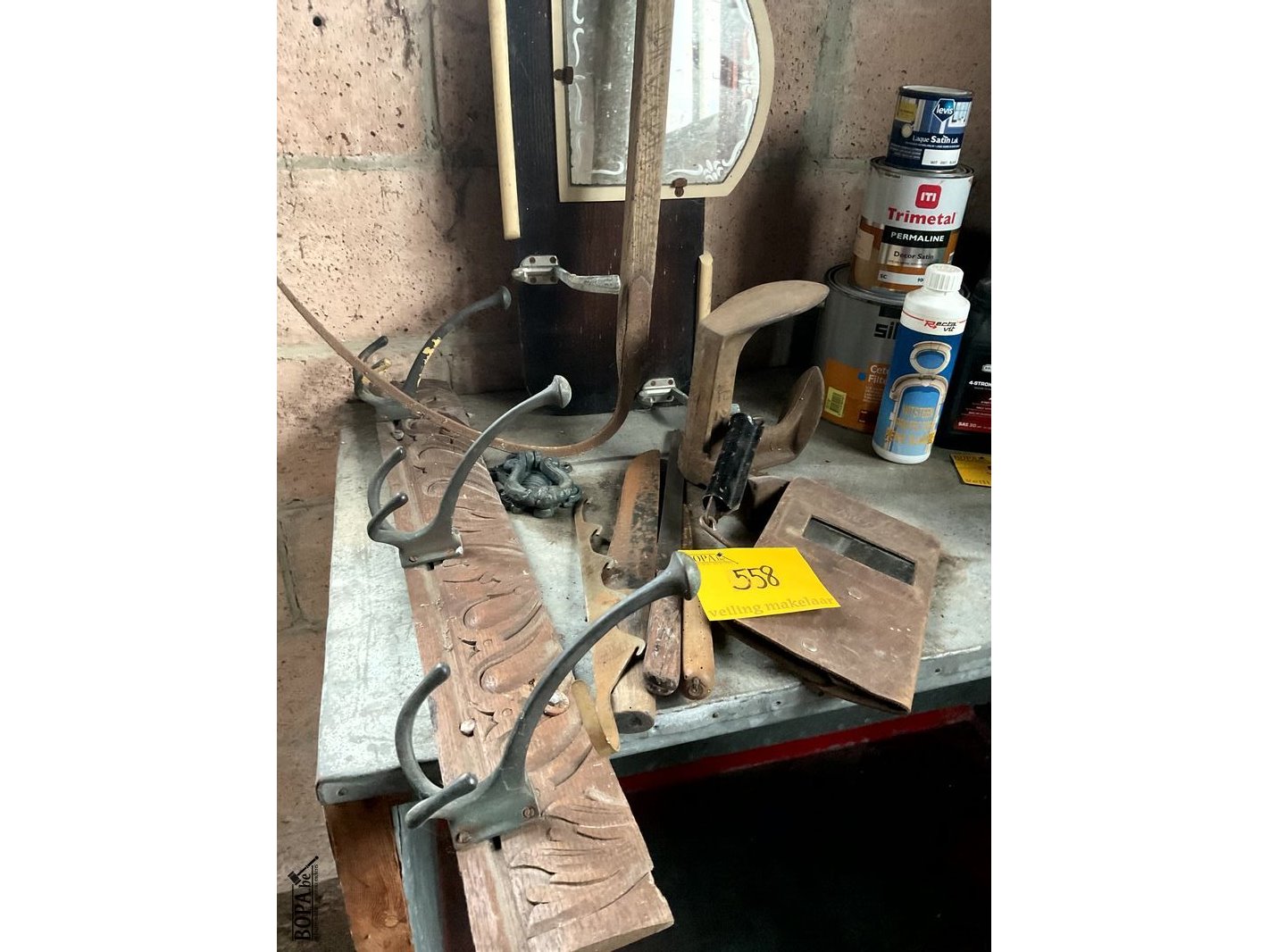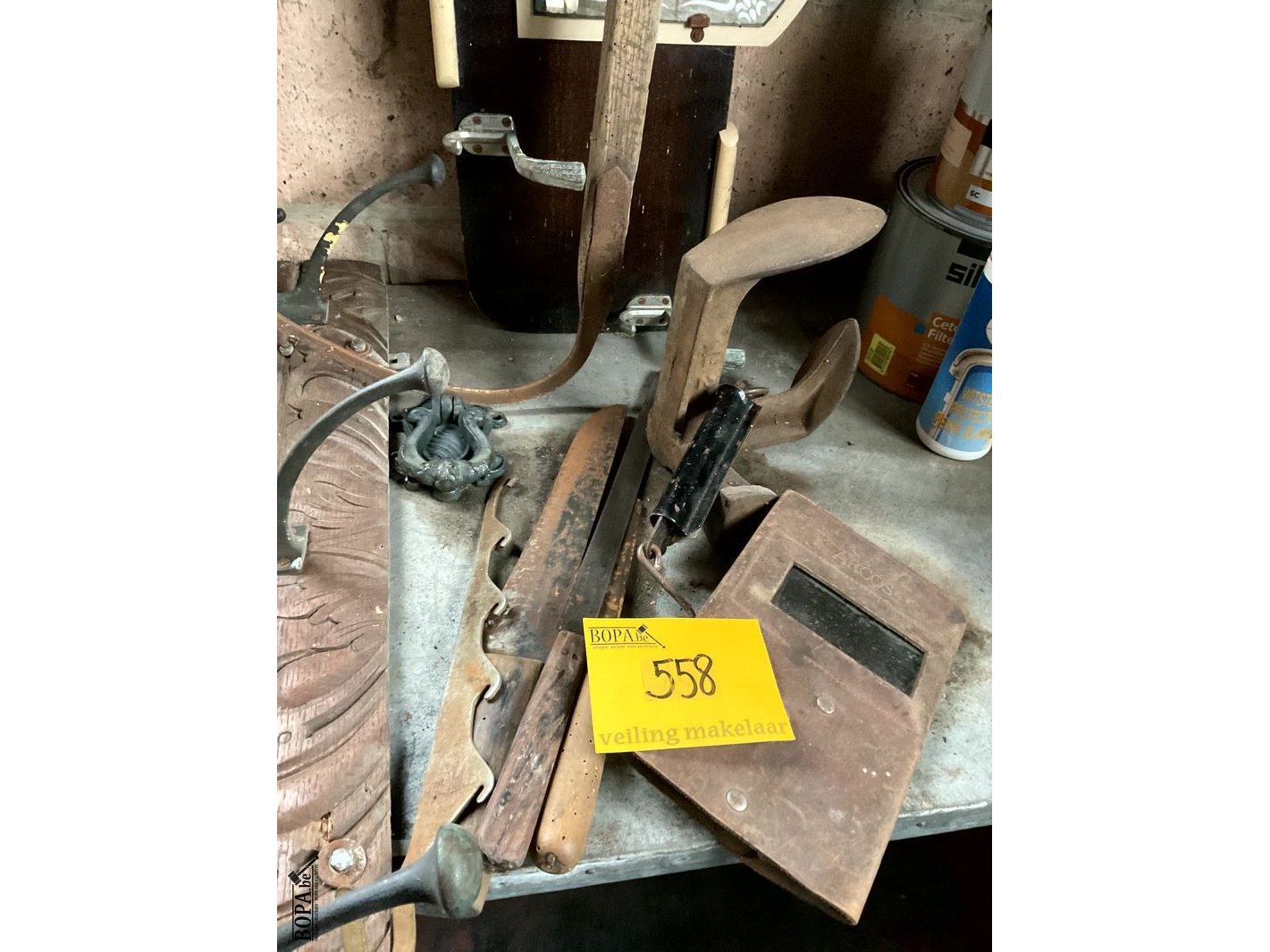 Kapstokken, messen, schoenaambeeld, dorsvlegel, deurklopper, soldeerbril, weegschaal, 11 stuks