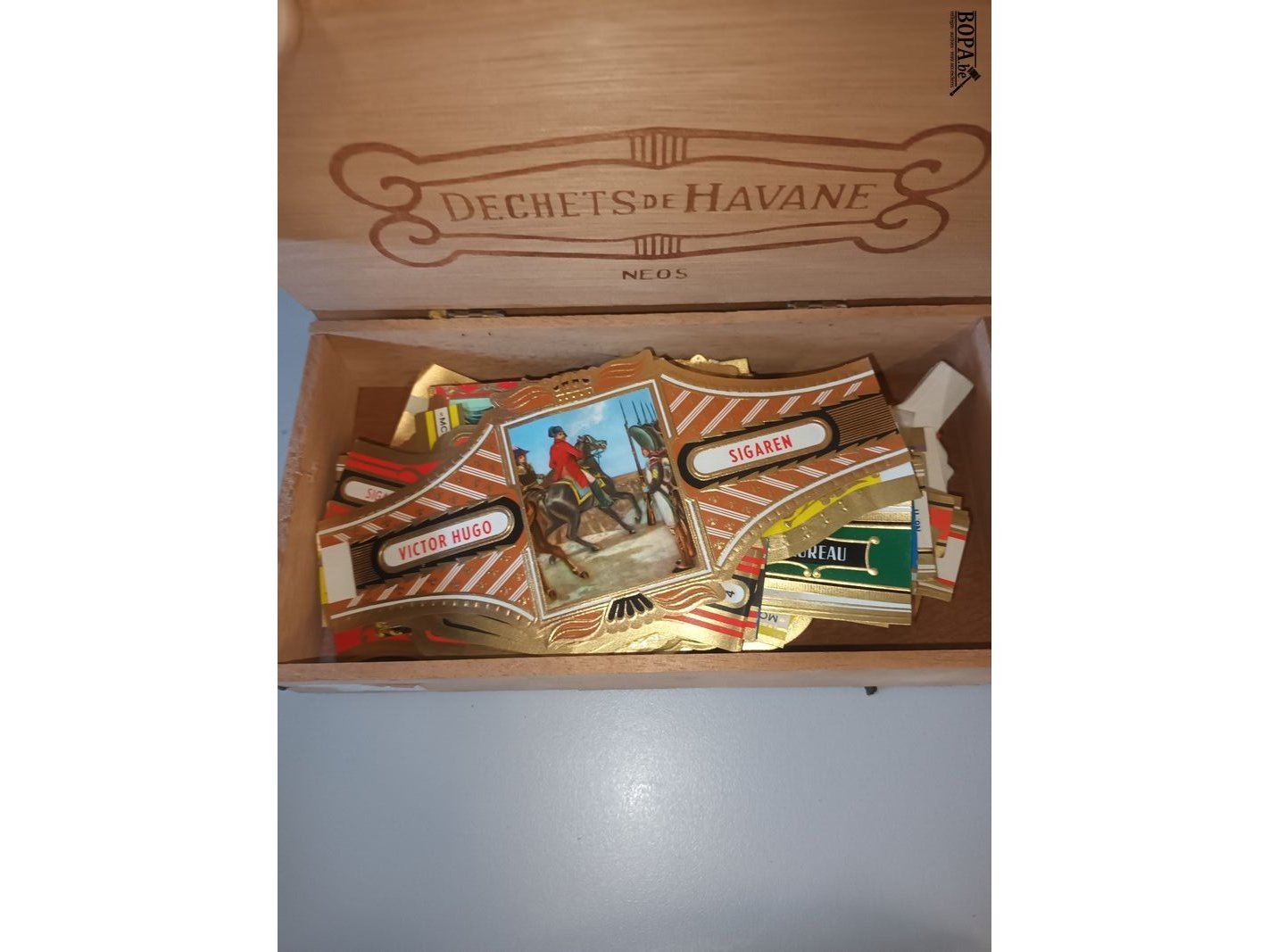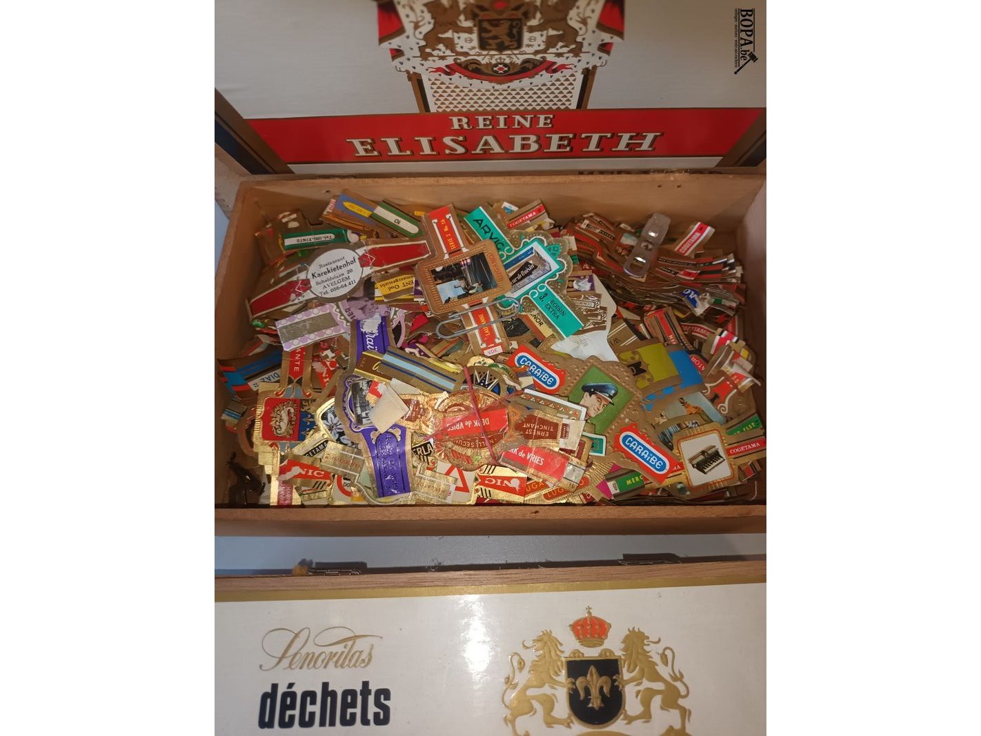 Verzameling sigarenbandjes. 5 doosjes en 4 zakjes.