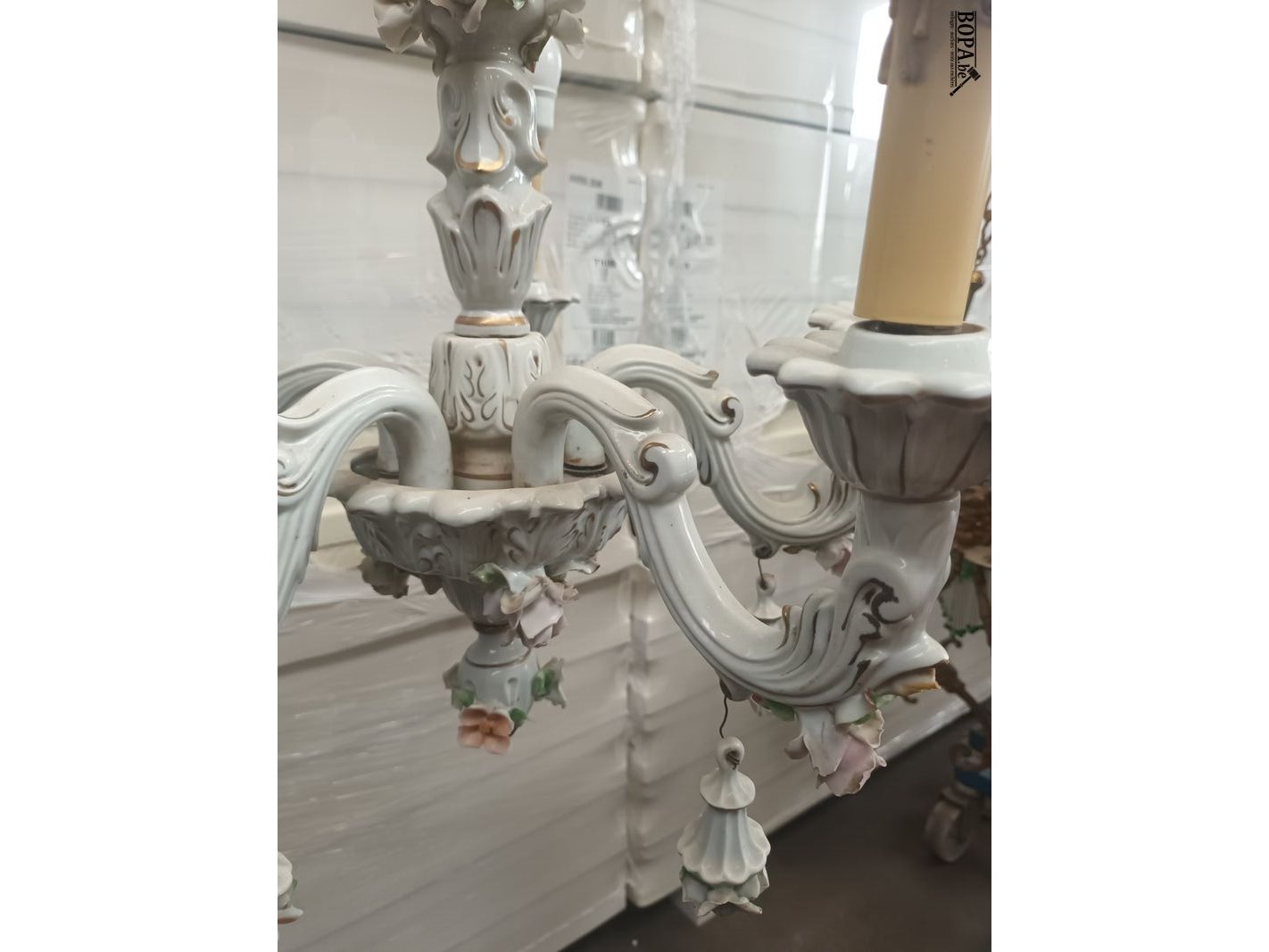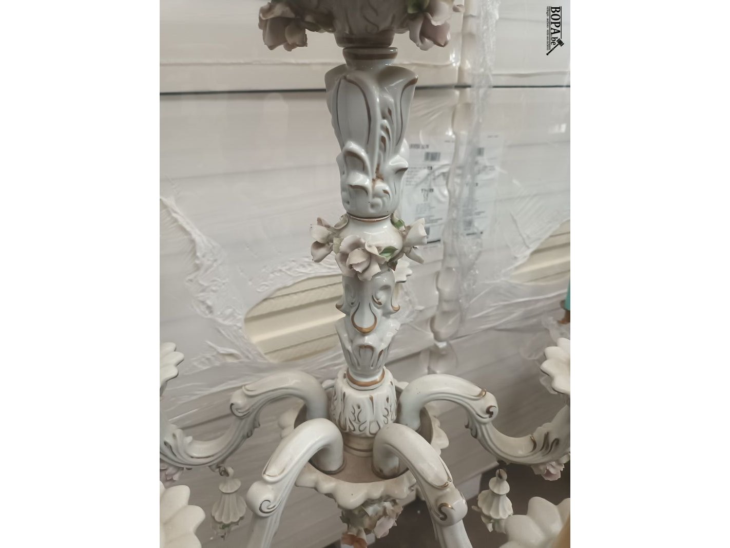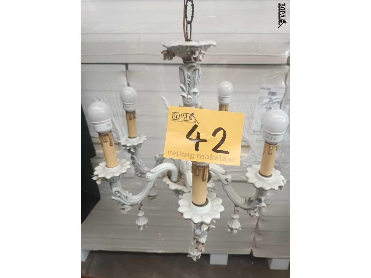 Luster in porselein. Diameter 46 cm. Hoogte 80 cm.