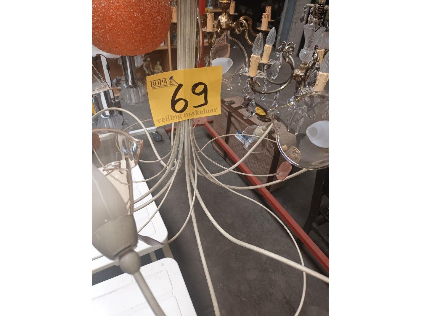 Moderne luster met 1 ontbrekende lampenkap. Diameter 95 cm. Hoogte 88 cm.