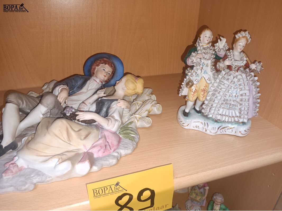 Beeldjes in porselein. 23 stuks. Inhoud vitrine kast. Hoogte 13 cm tot 33 cm.