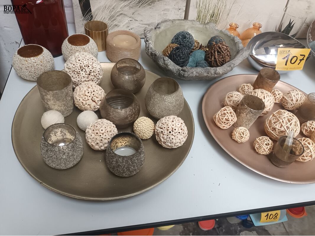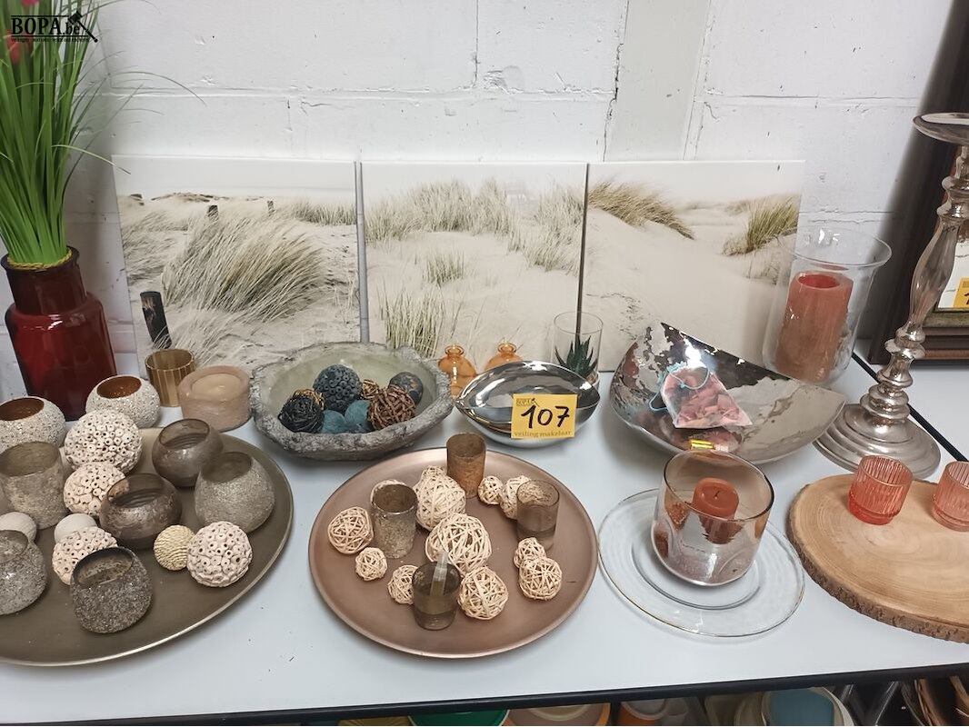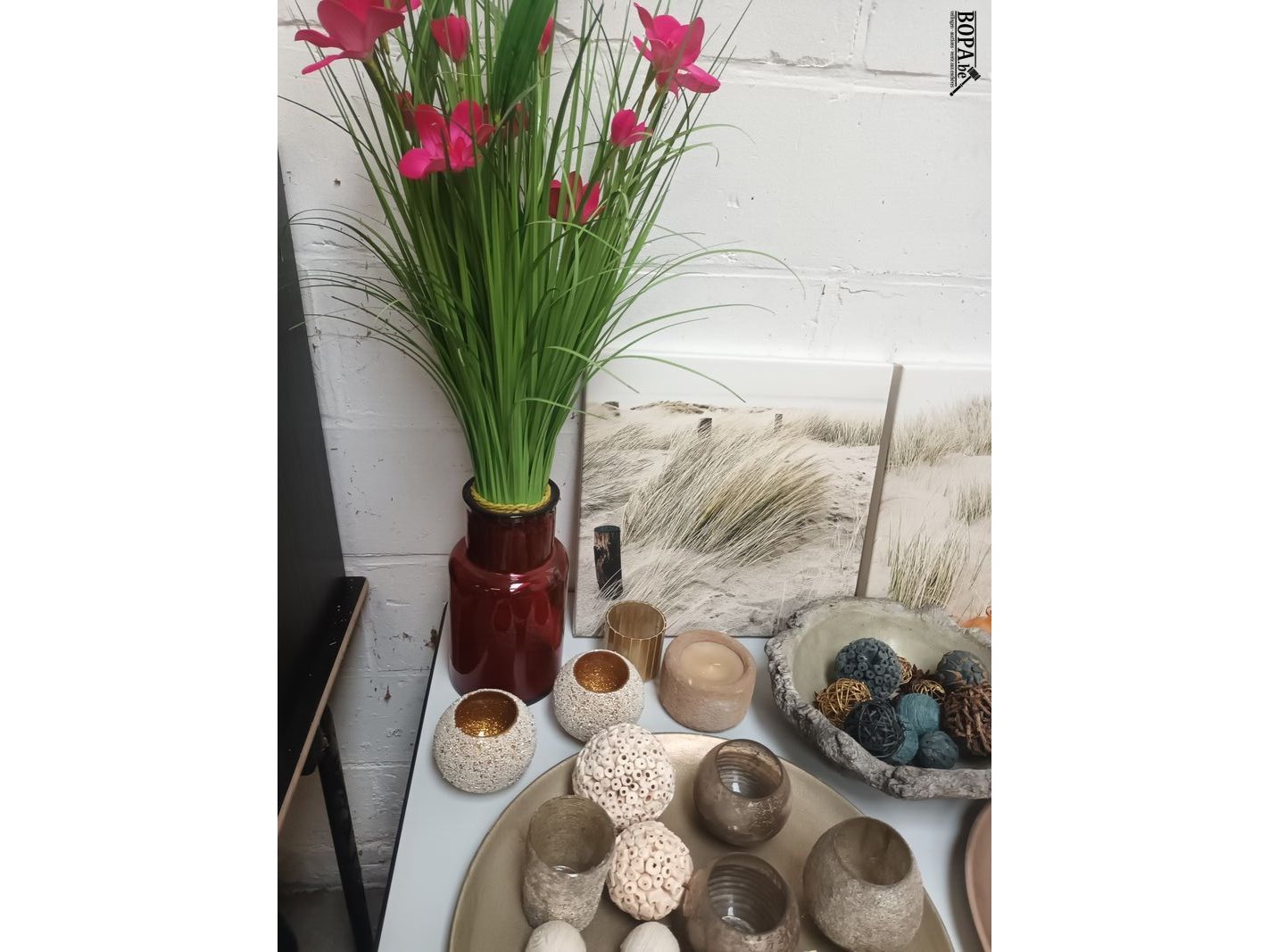 Decoratie. Sierbloemen in vaas, kaarsenhouders, kaders, etc.