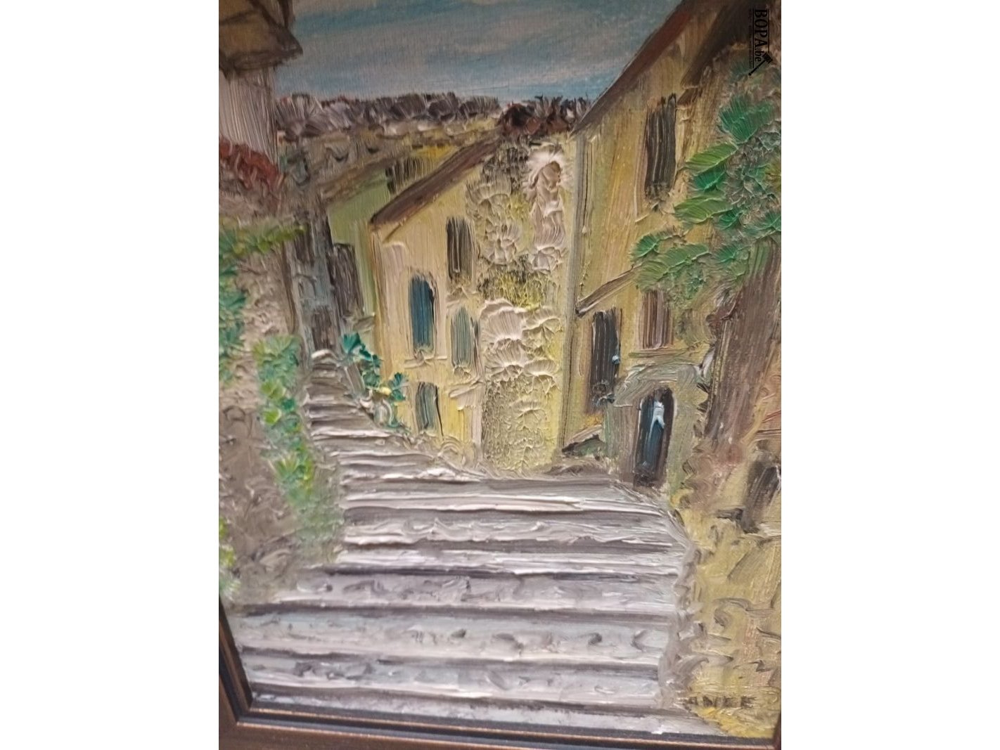 Schilderij straat met trappen getekend Ange. 31 x 38 cm.