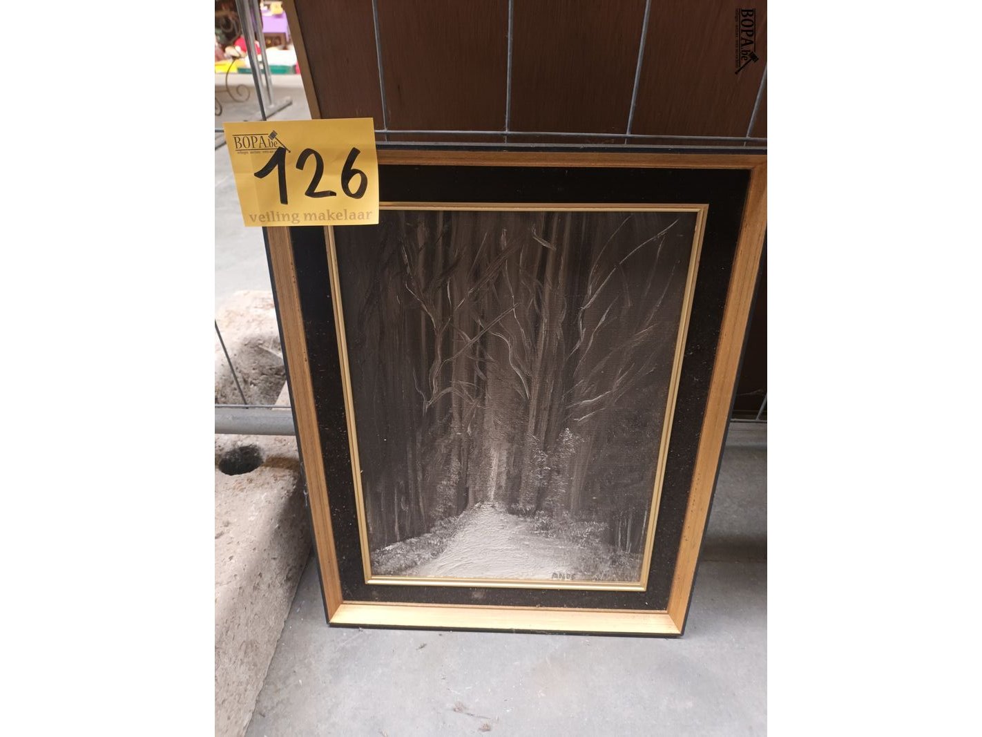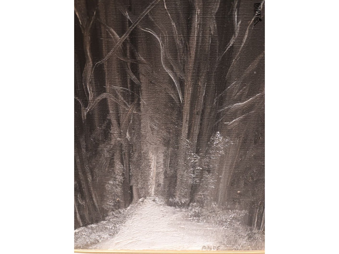 Schilderij boslandschap met sneeuw getekend Ange. 39 x 49 cm.