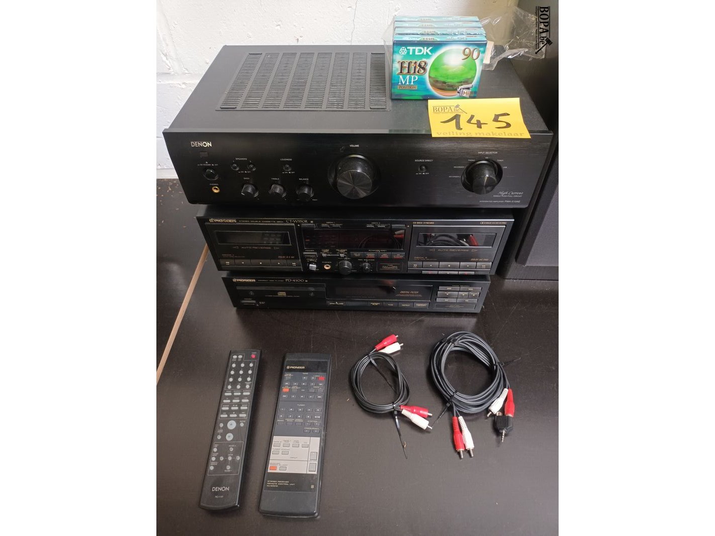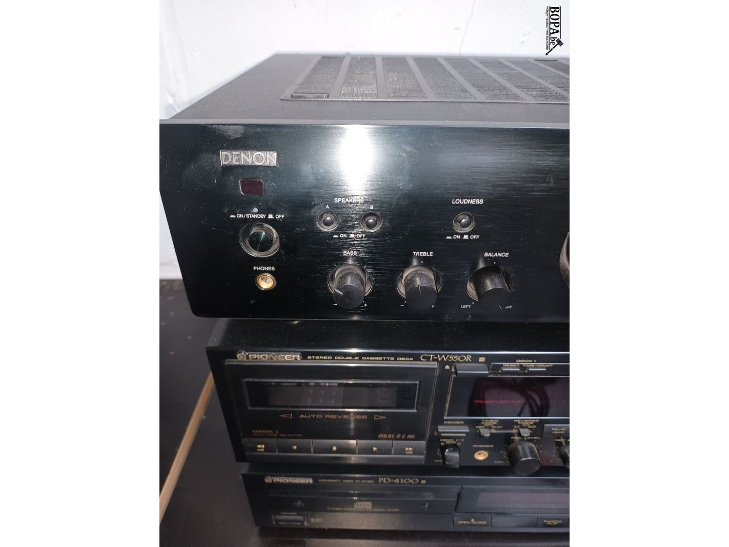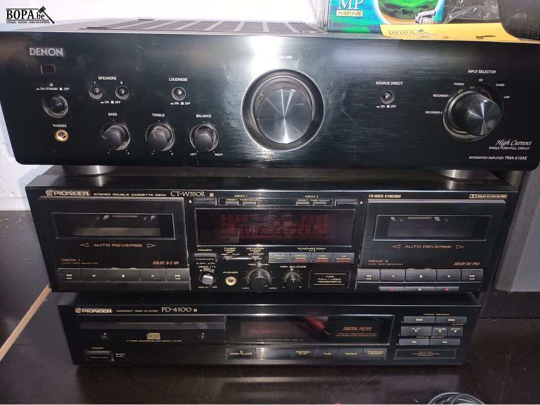 Muziekinstallatie bestaande uit Denon integrated amplifier PMA-510AE, Pioneer stereo cassette deck CT-W550R en Pioneer cd speler PD-4100.