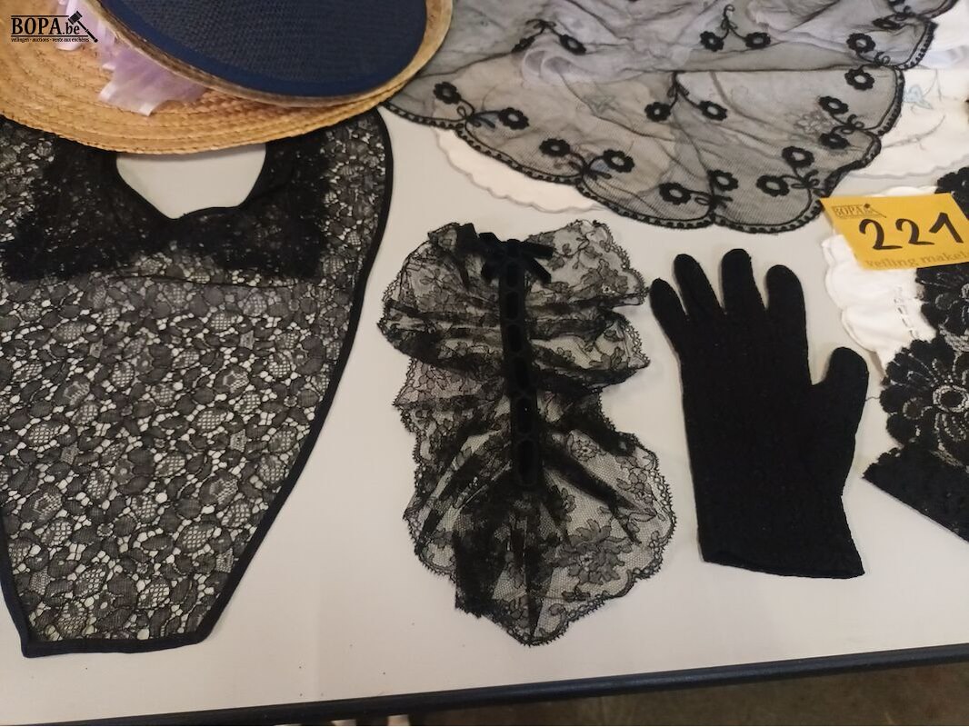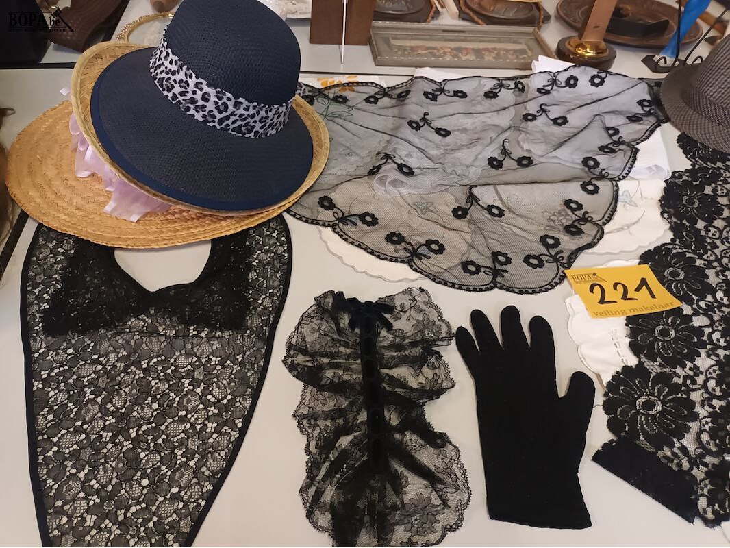 Sjaals in zwart kantwerk, 4 hoeden en een lot tafelkleedjes.