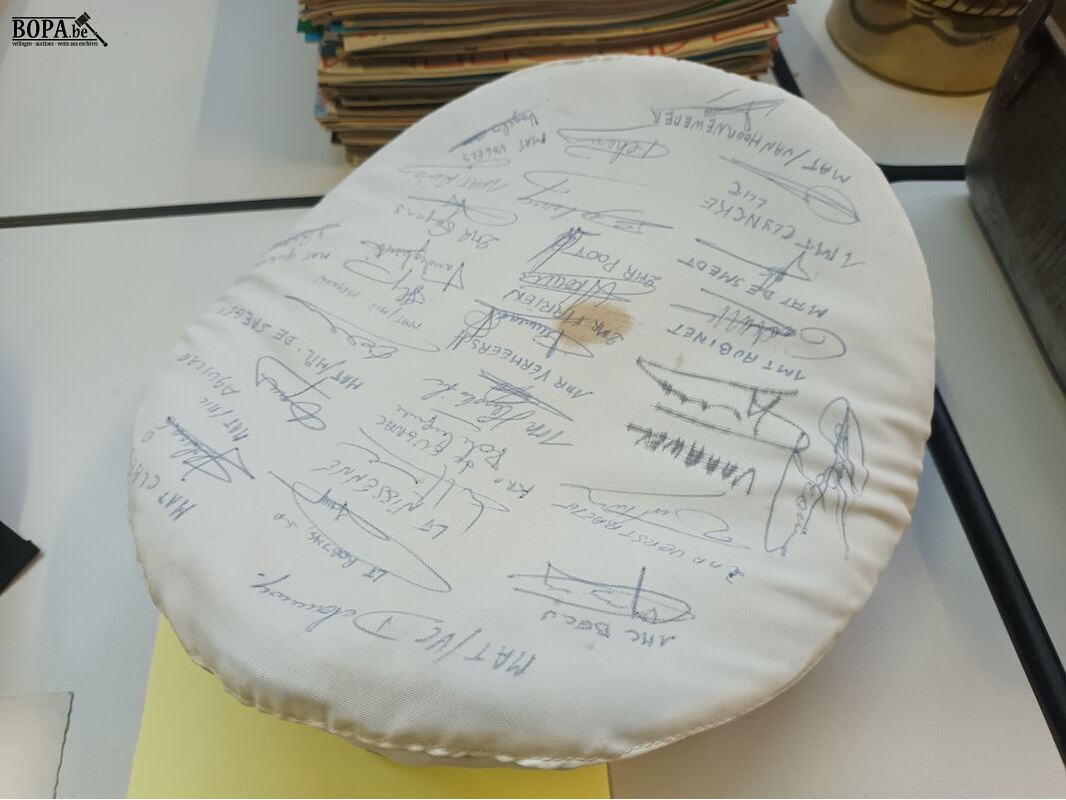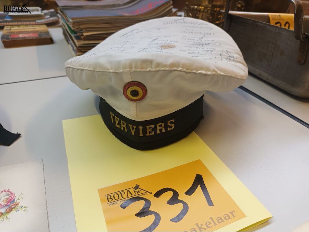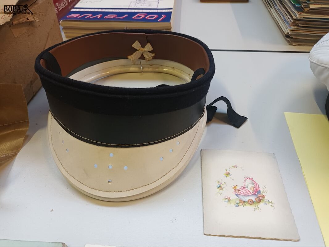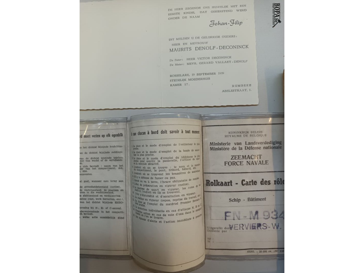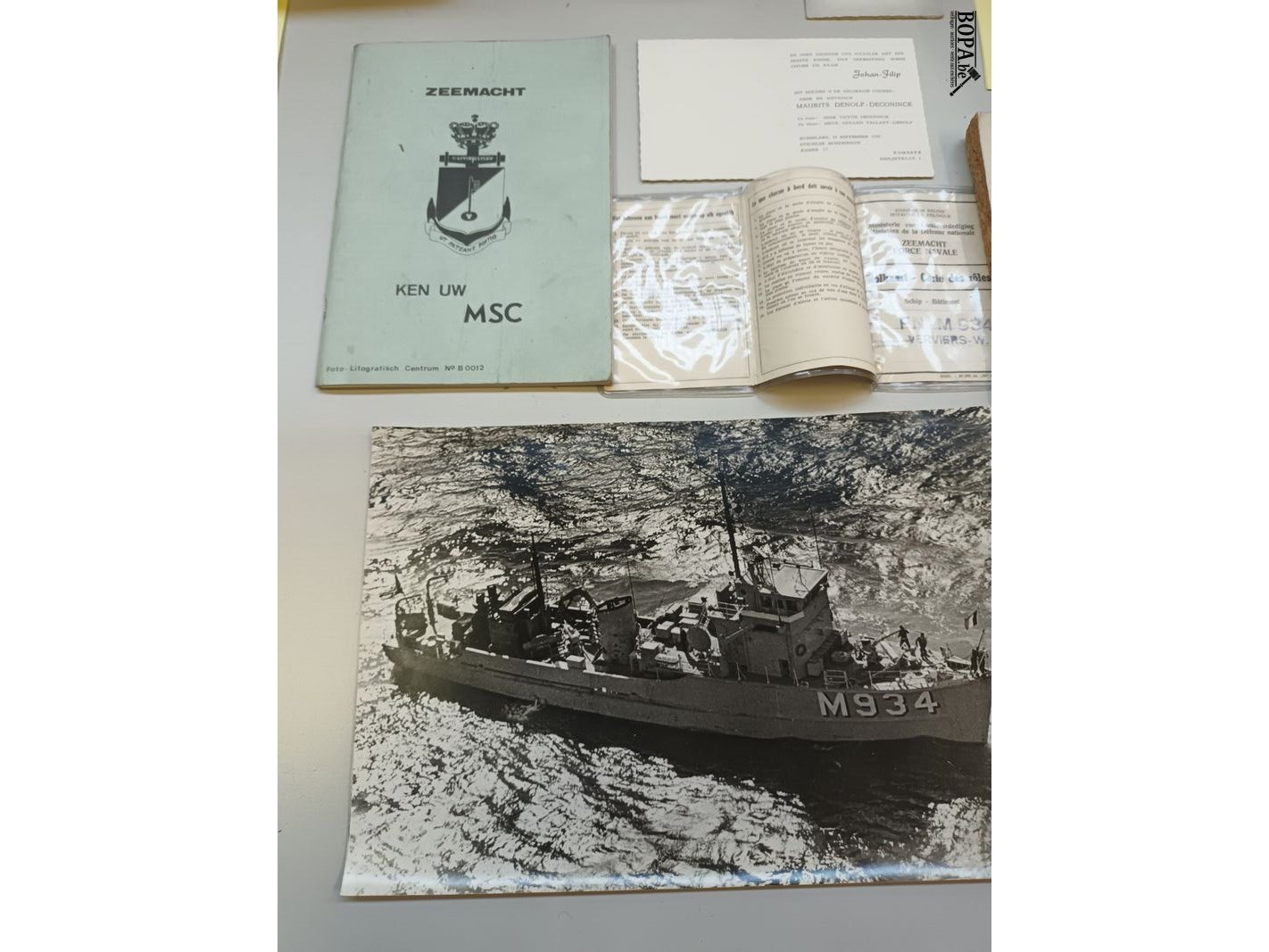 Items Belgische marine. 8 stuks. Foto M934, foto en portret M906, rolkaart, 2 x geboortekaartje, boekje zeemacht “Ken uw MSC, band voor kepie, kepie met handtekeningen van de bemanning van M934. De matroos is verongelukt met zijn moto. Deze kepie werd op de begrafenis gegeven aan zijn ouders door de bemanning van het schip.