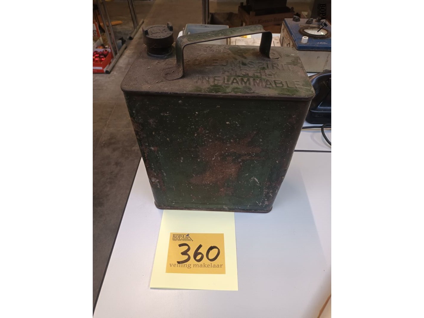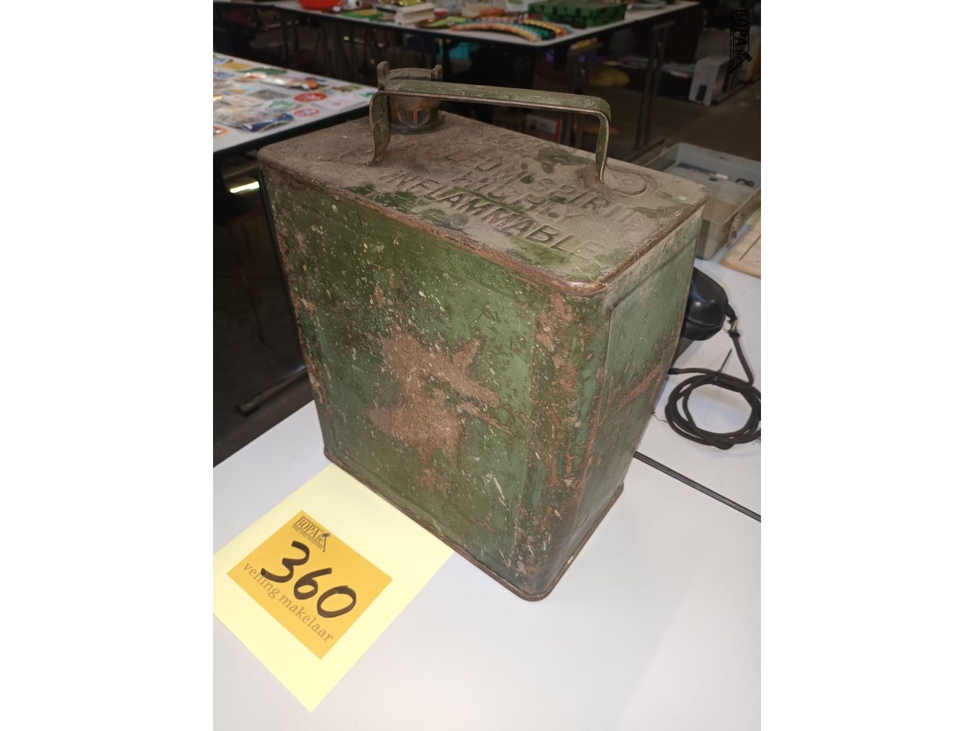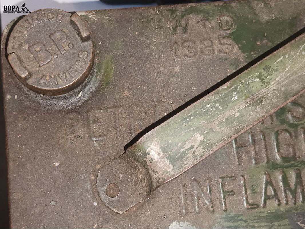 Metalen bidon War departement 1935. Dop “B.P. Anvers. 25 x 15 x 32 cm.