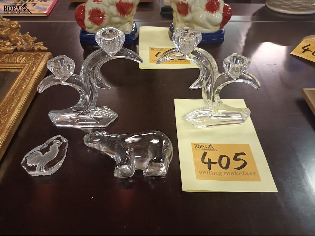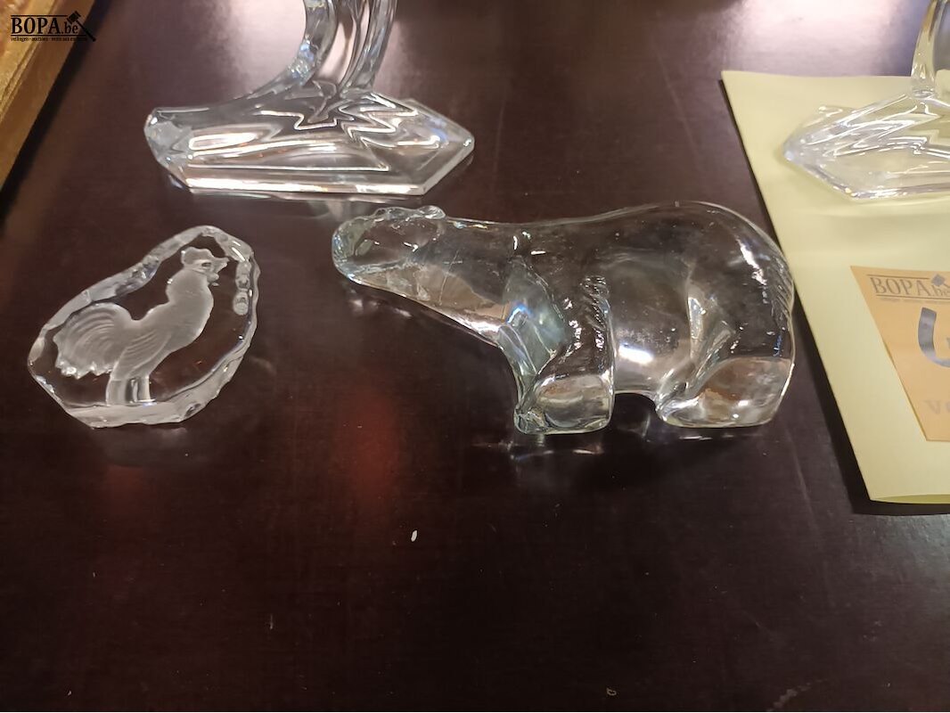 Kristal. 4 stuks. 2 kandelaars, haan en ijsbeer.