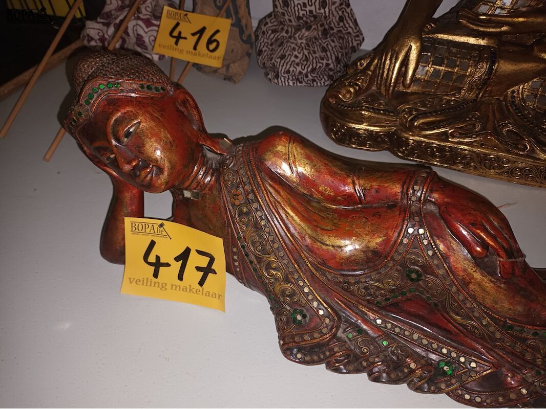 Houten beeld liggende Boeddha. 57 x 15 x 20 cm.
