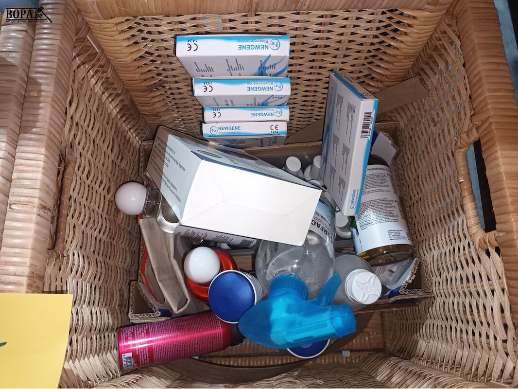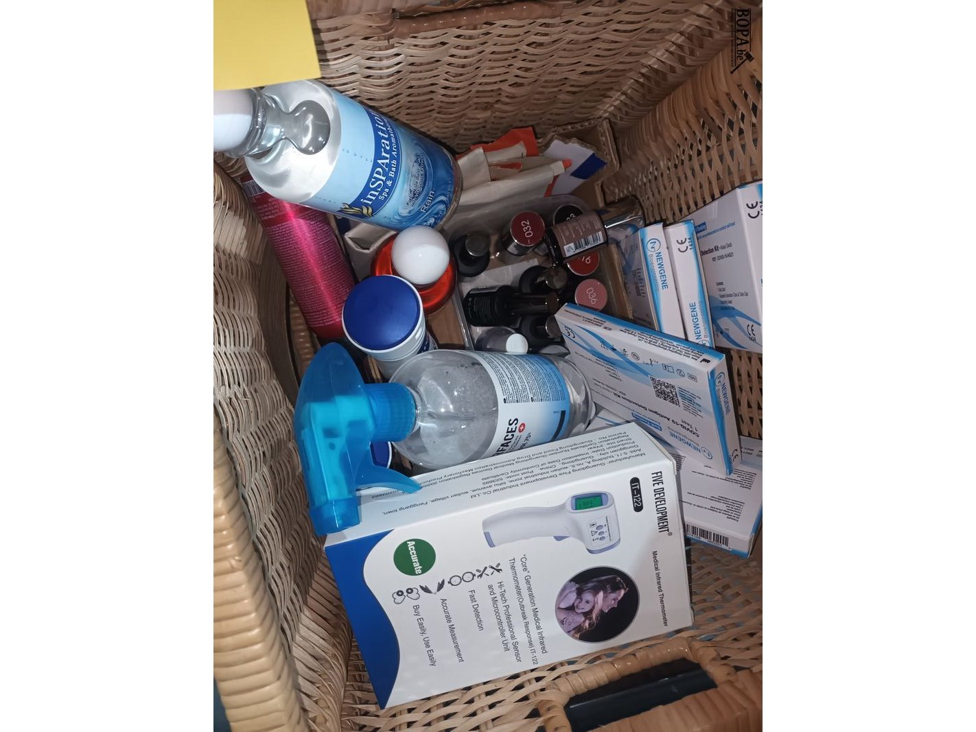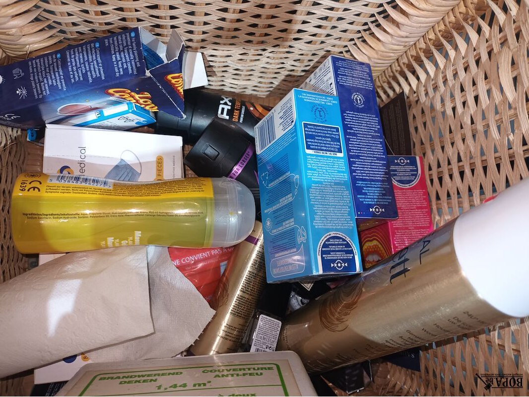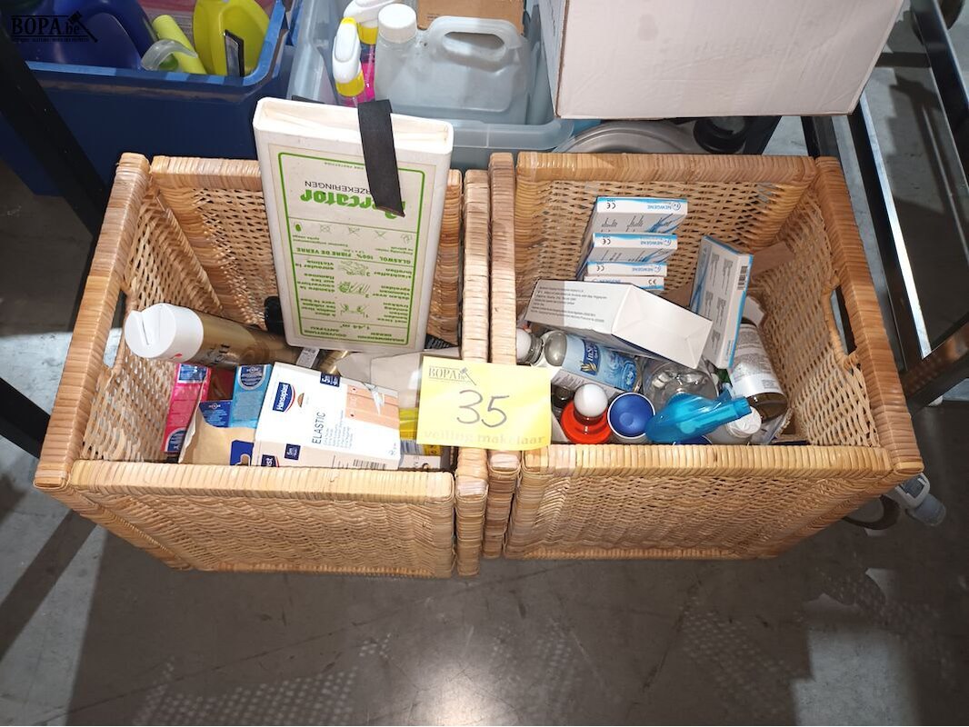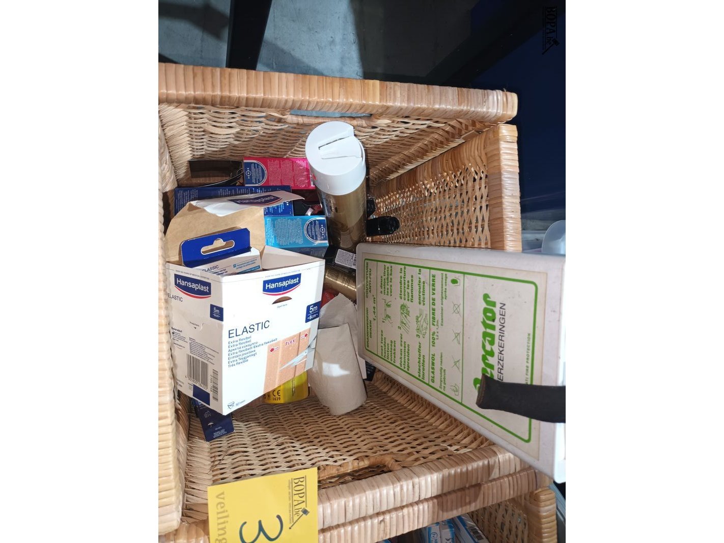 2 manden met EHBO materiaal en producten voor persoonlijke verzorging.