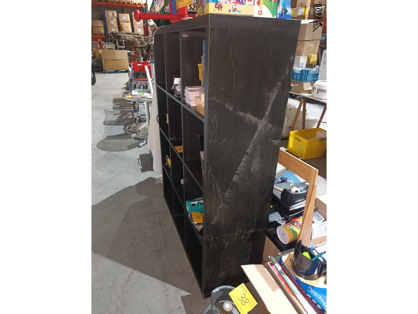 Zwarte vakkenkast. 112 x 39 x 147 cm.