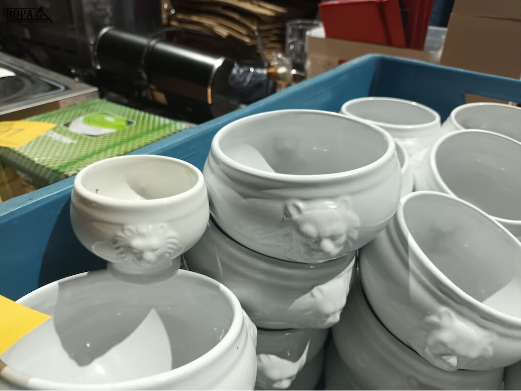33 grote en 10 kleine leeuwenkop soeptassen. Bak niet inbegrepen.
